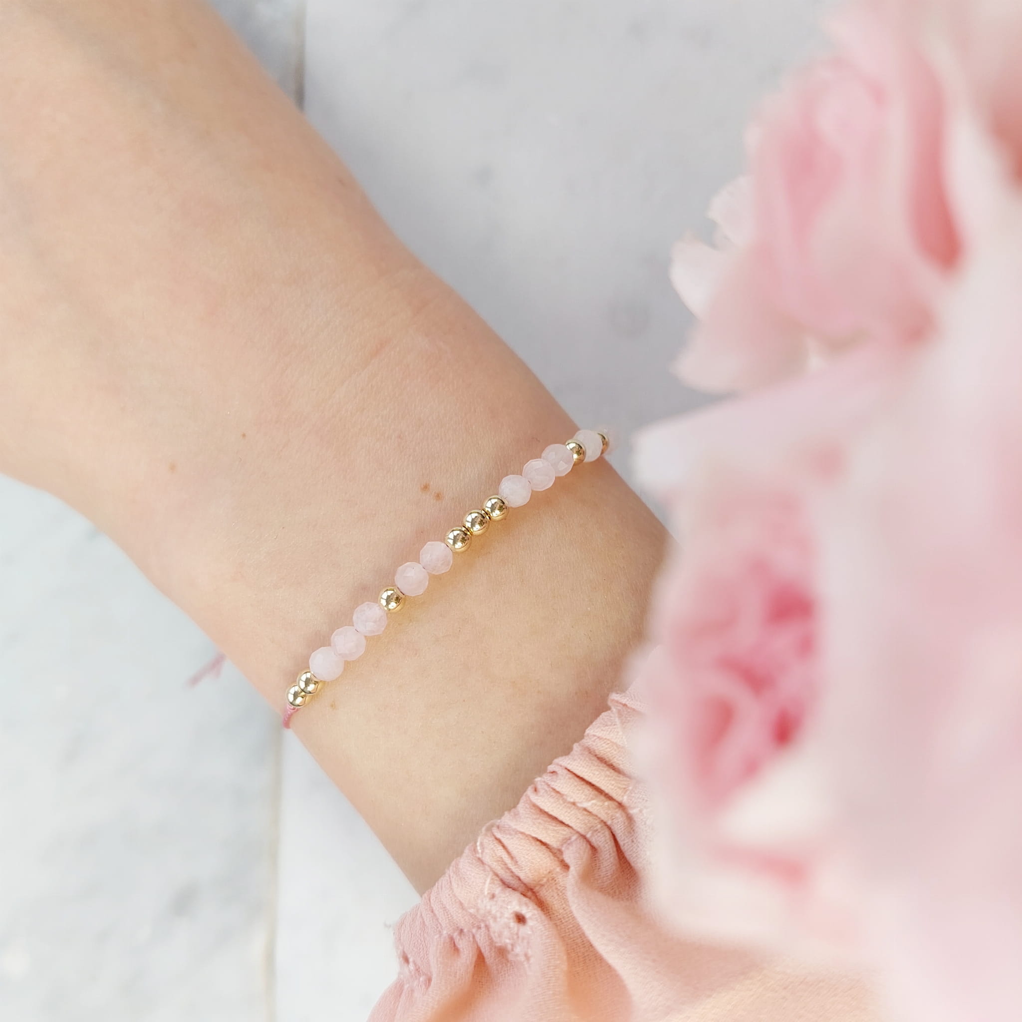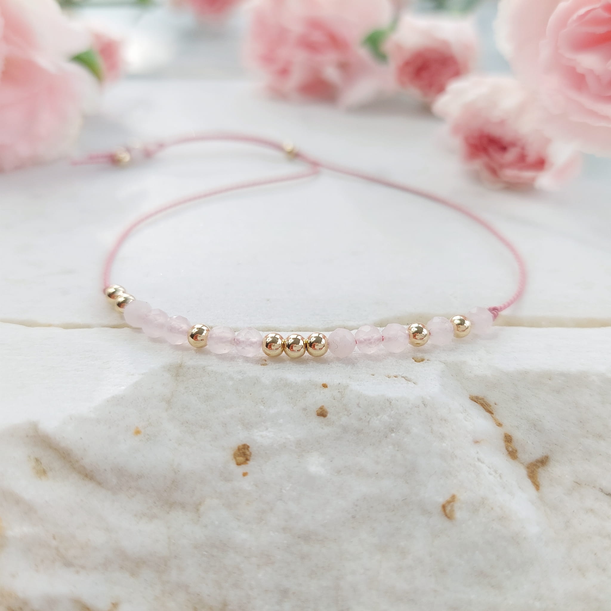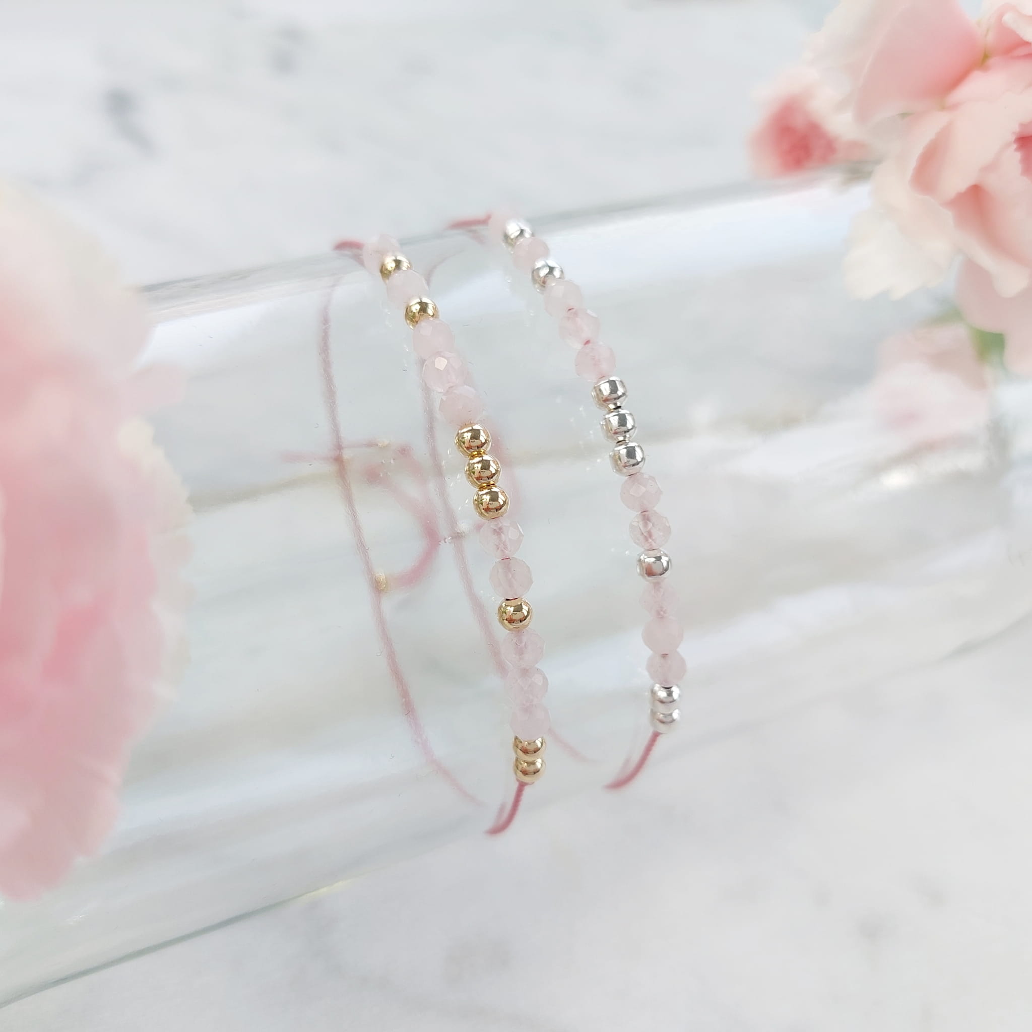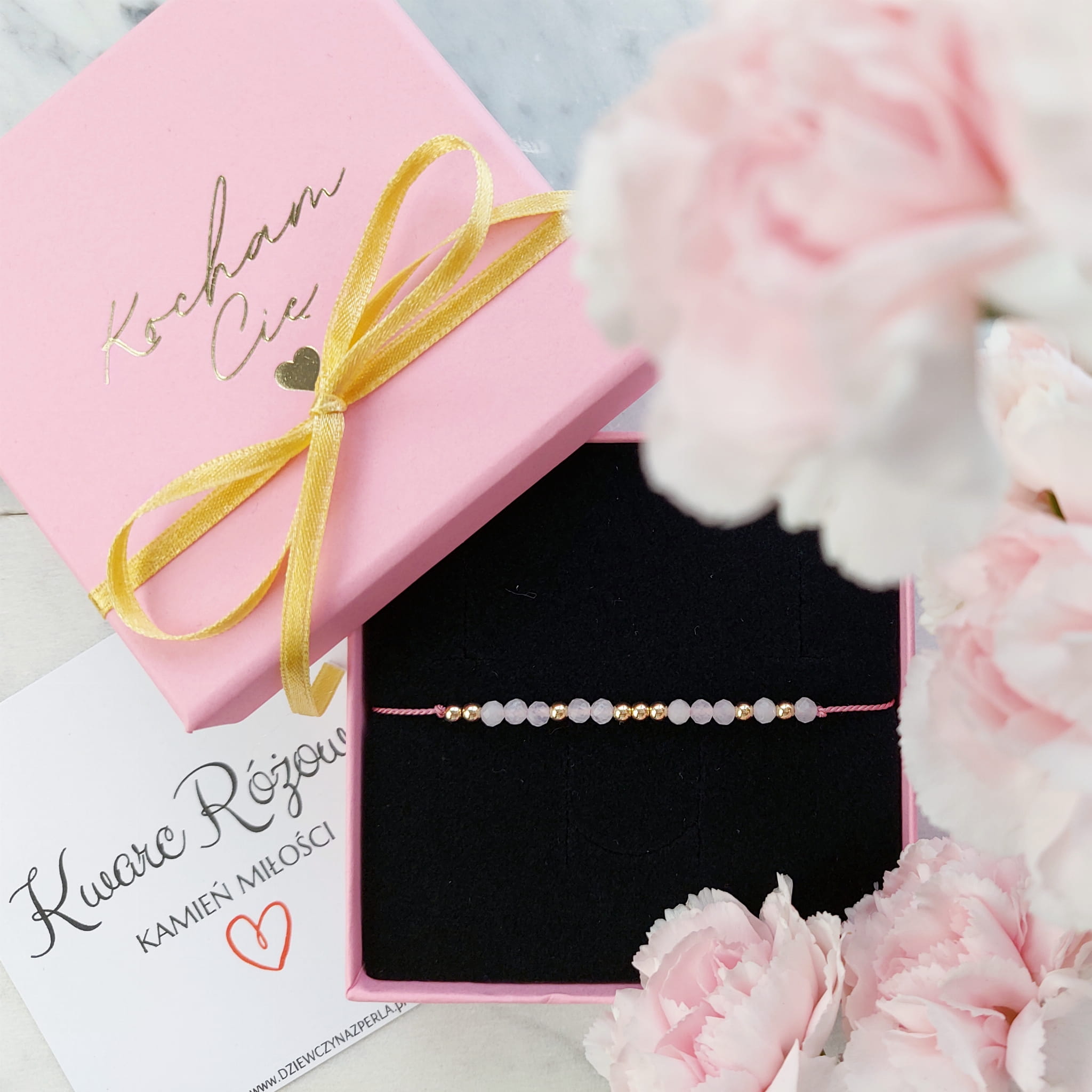 Bransoletka MIŁOŚĆ. Złoto, Srebro, Kwarc Różowy, Granat. Walentynki