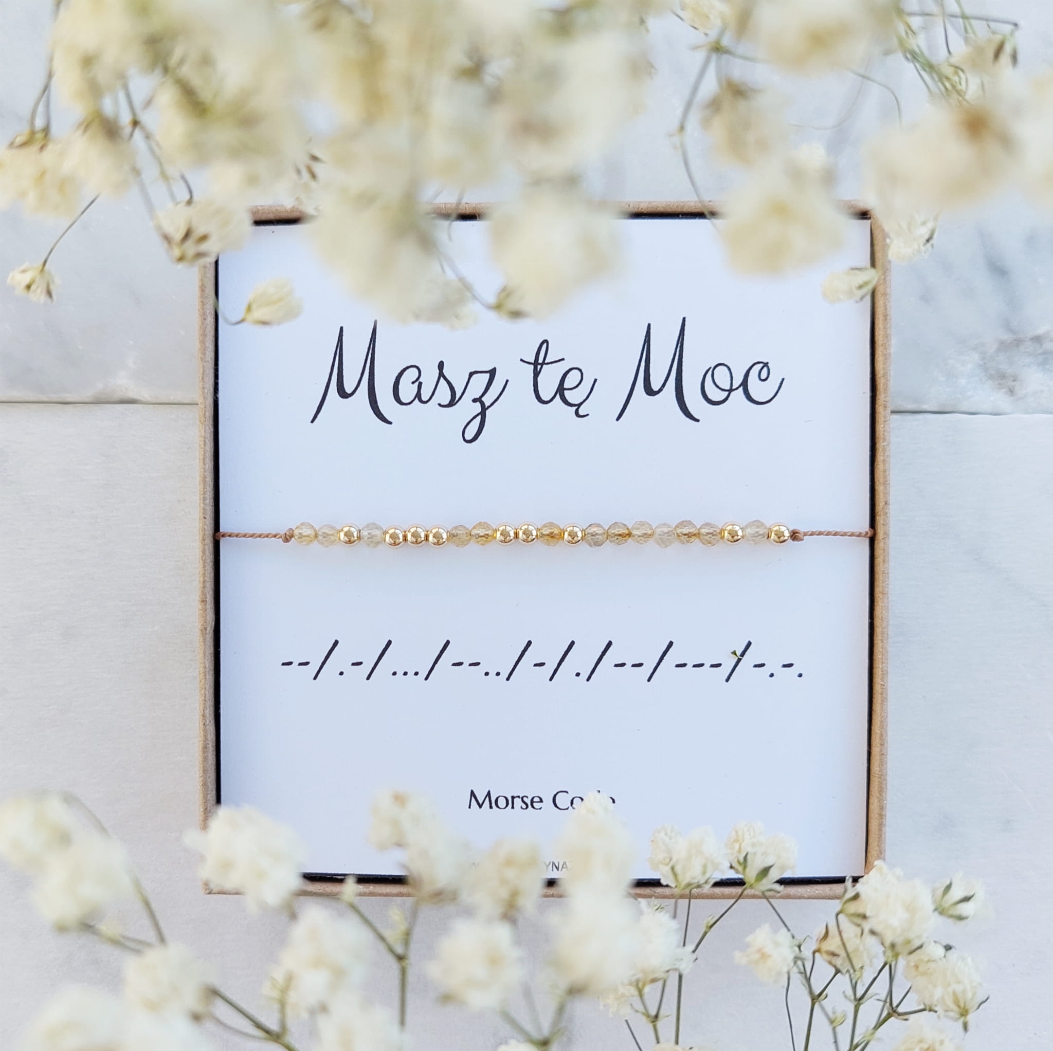 Bransoletki umieszczone są na kartoniku z napisem 'Masz tę Moc' przetłumaczonym na alfabet Morse'a. Następnie zapakowane w ozdobne pudełeczko owinięte w złotą bibułkę. Całość jest umieszczona w kolejnym pudełeczku obwiązanym złotą wstążką. Radość podczas rozpakowywania gwarantowana:)