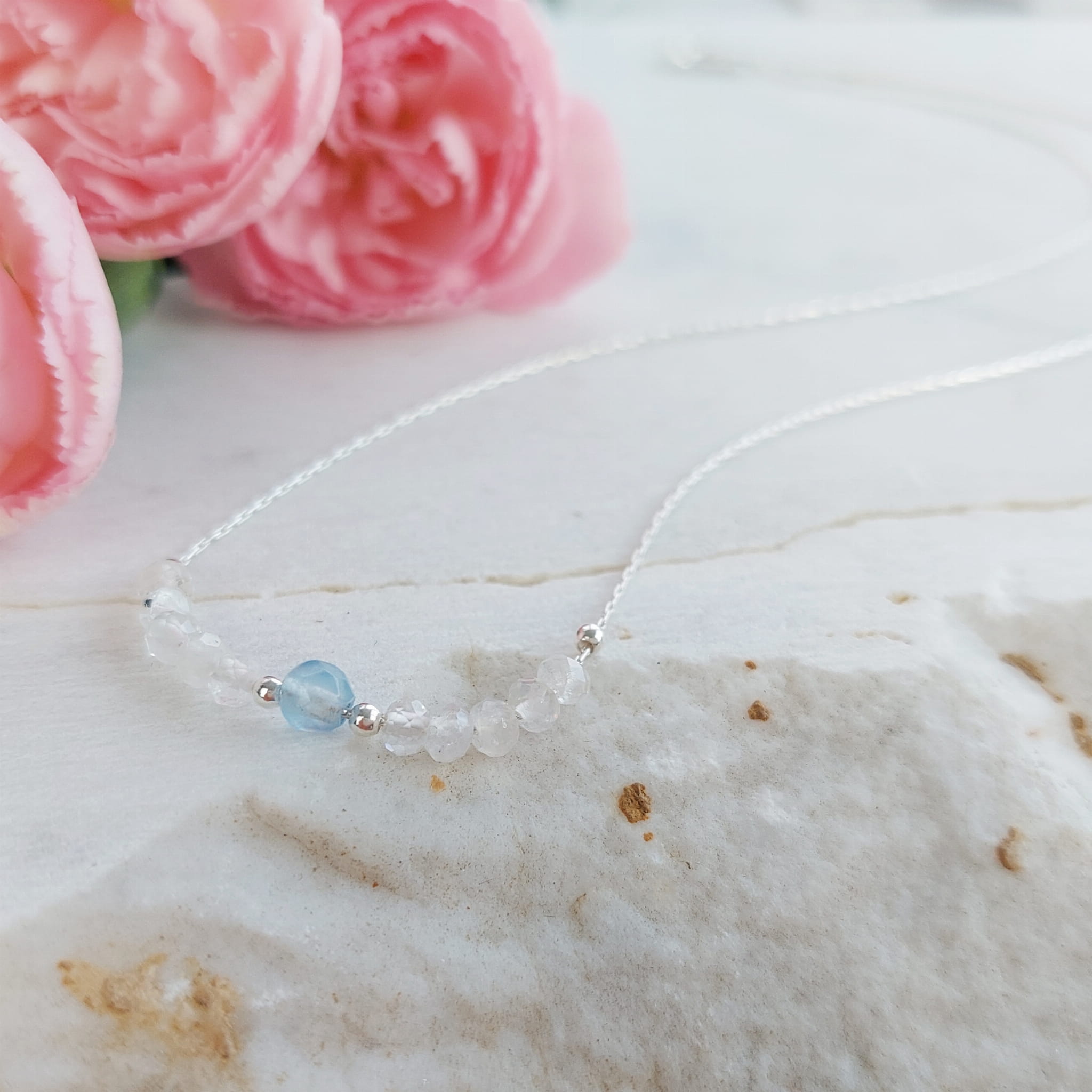 Materiał: akwamaryn, kamień księżycowy, srebro próby 925, 14 karatowe złoto (goldfilled)
