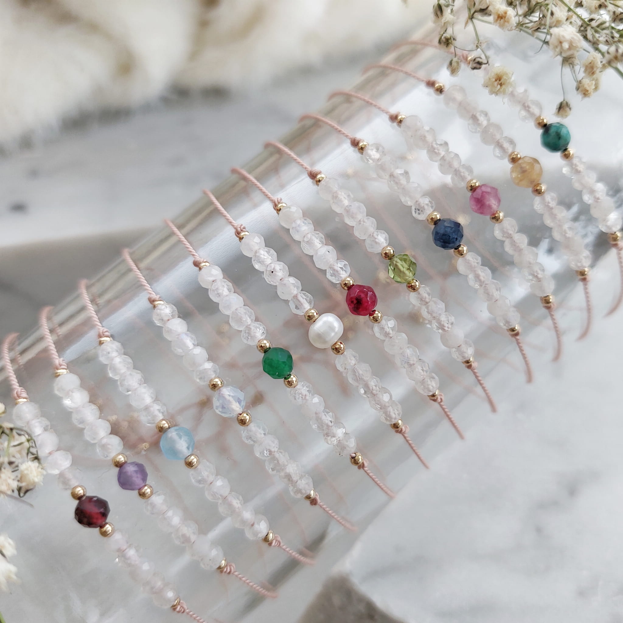 Bransoletka z kamieniem urodzinowym, otoczona wianuszkiem kamieni księżycowych.