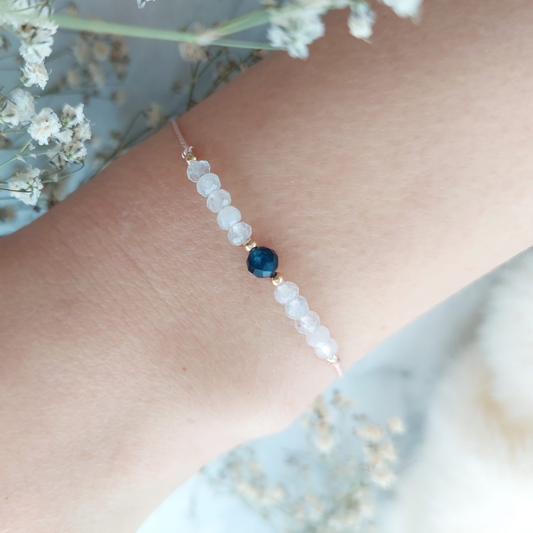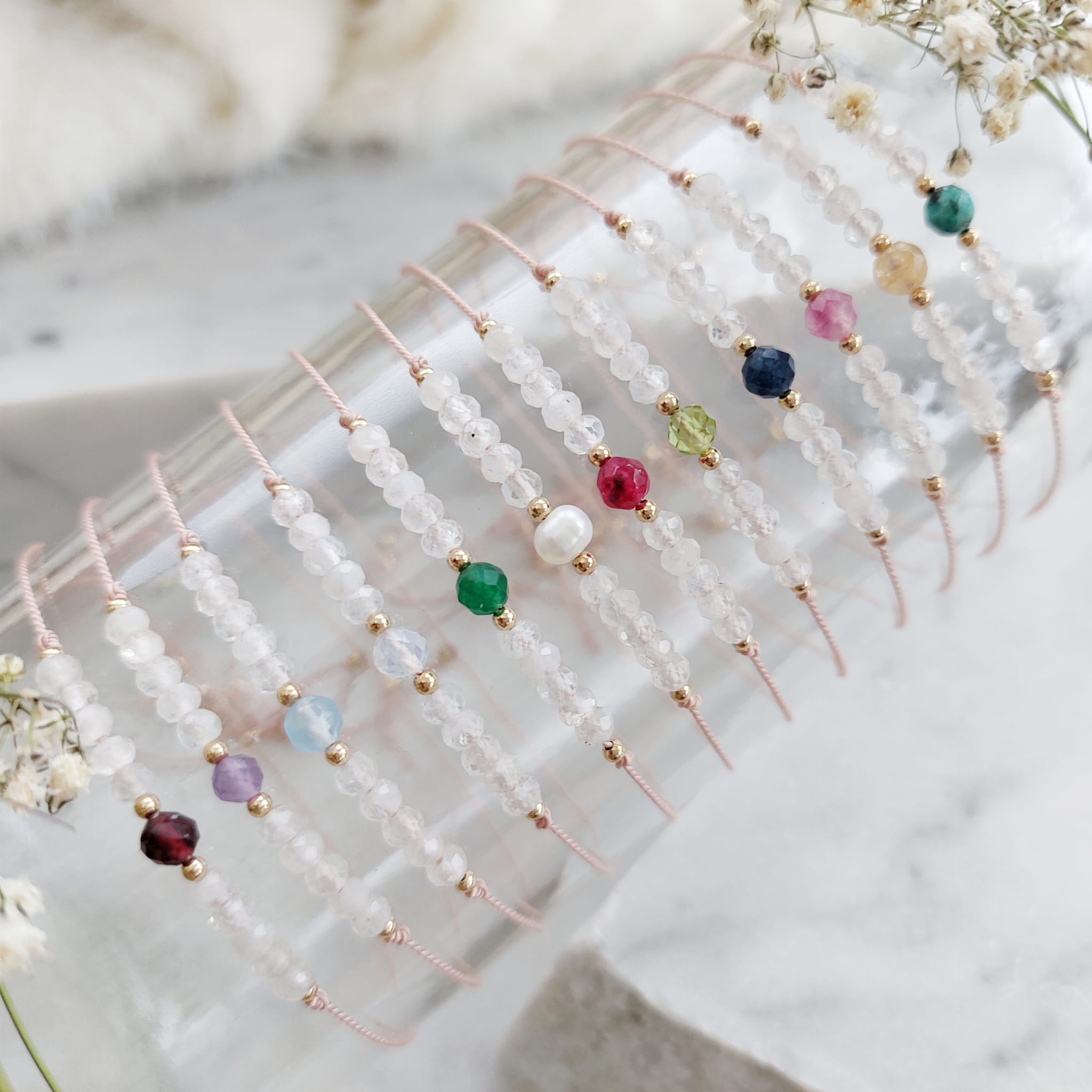 Bransoletka z kamieniem urodzinowym, otoczona wianuszkiem kamieni księżycowych.
