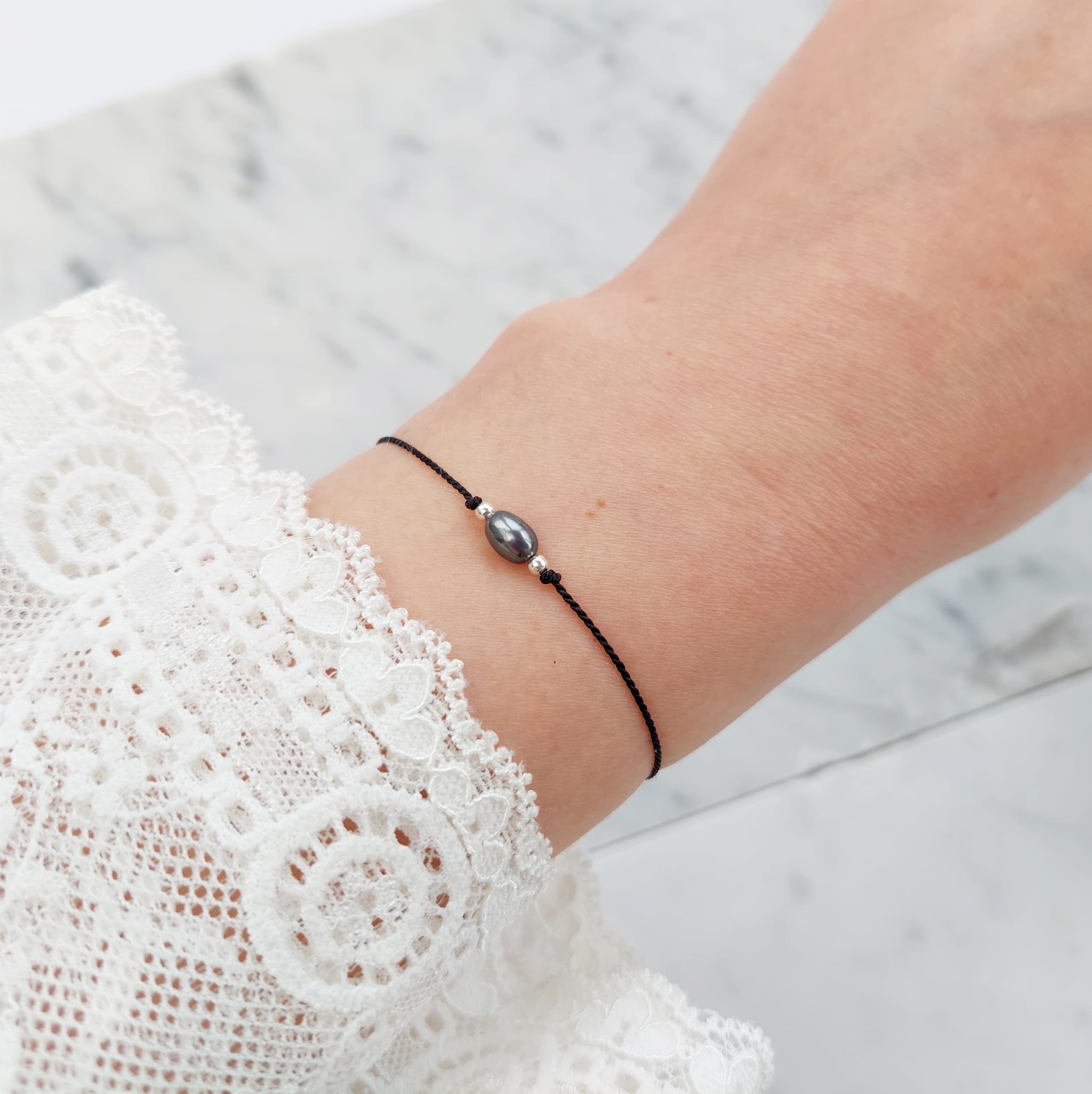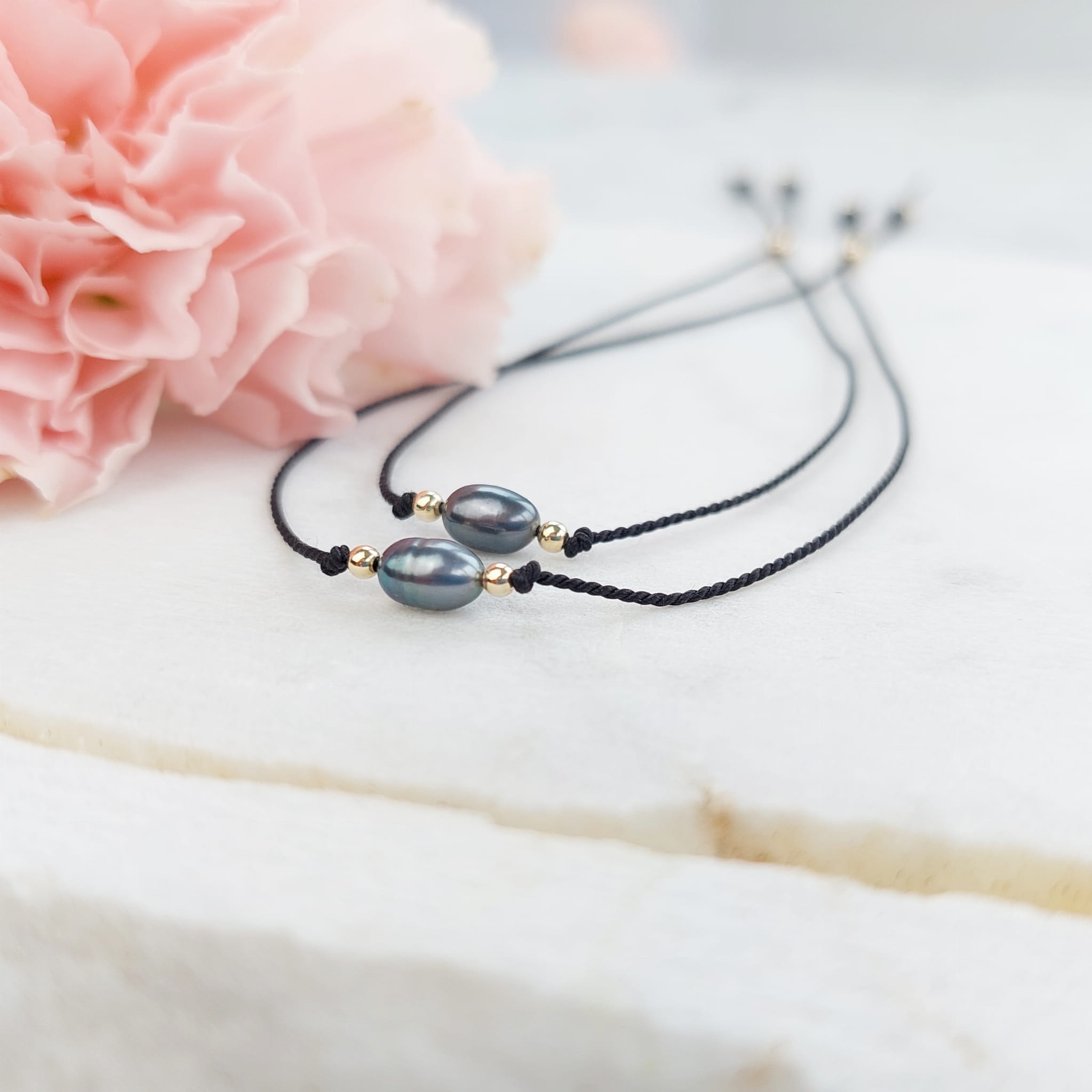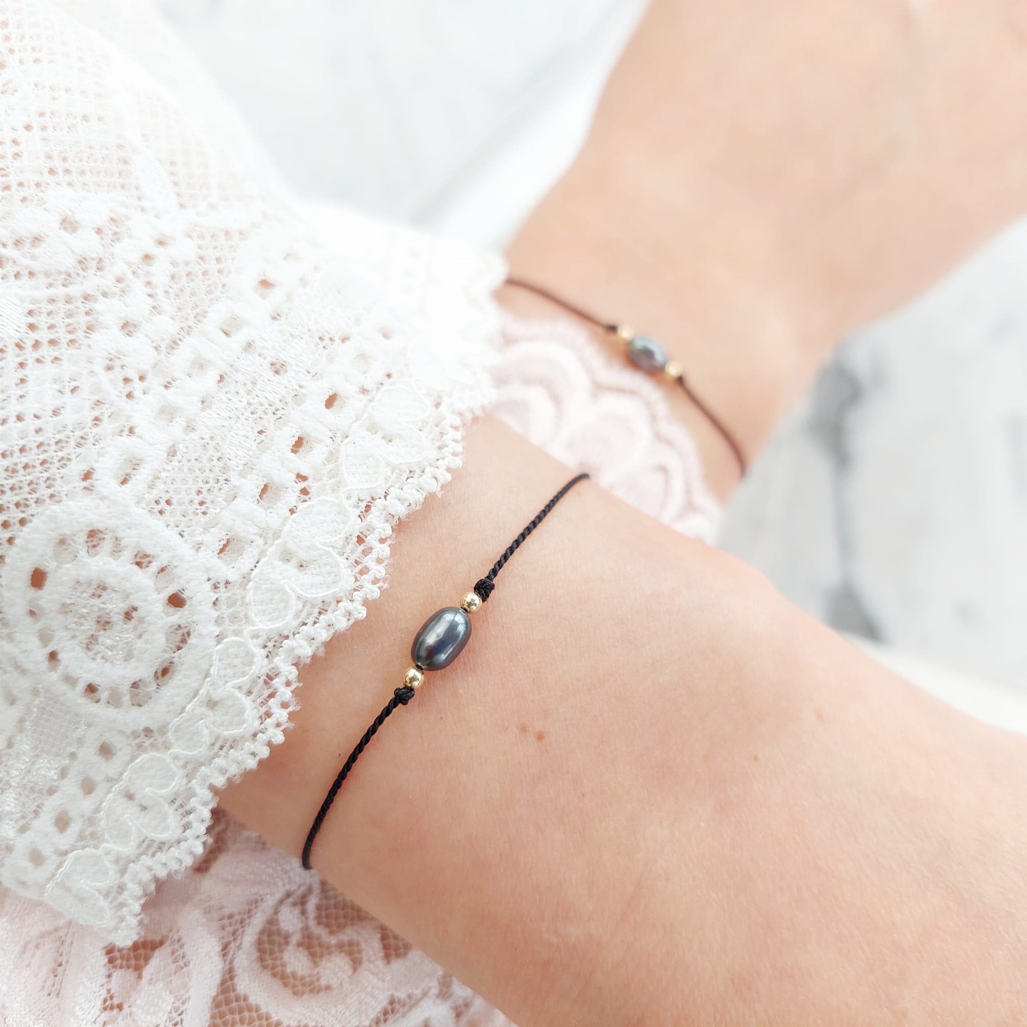 Komplet delikatnych bransoletek z perełkami dla Mamy i Córki. Pojedyncze perełki na jedwabnym sznureczku z zapięciem regulowanym silikonowym stoperem.