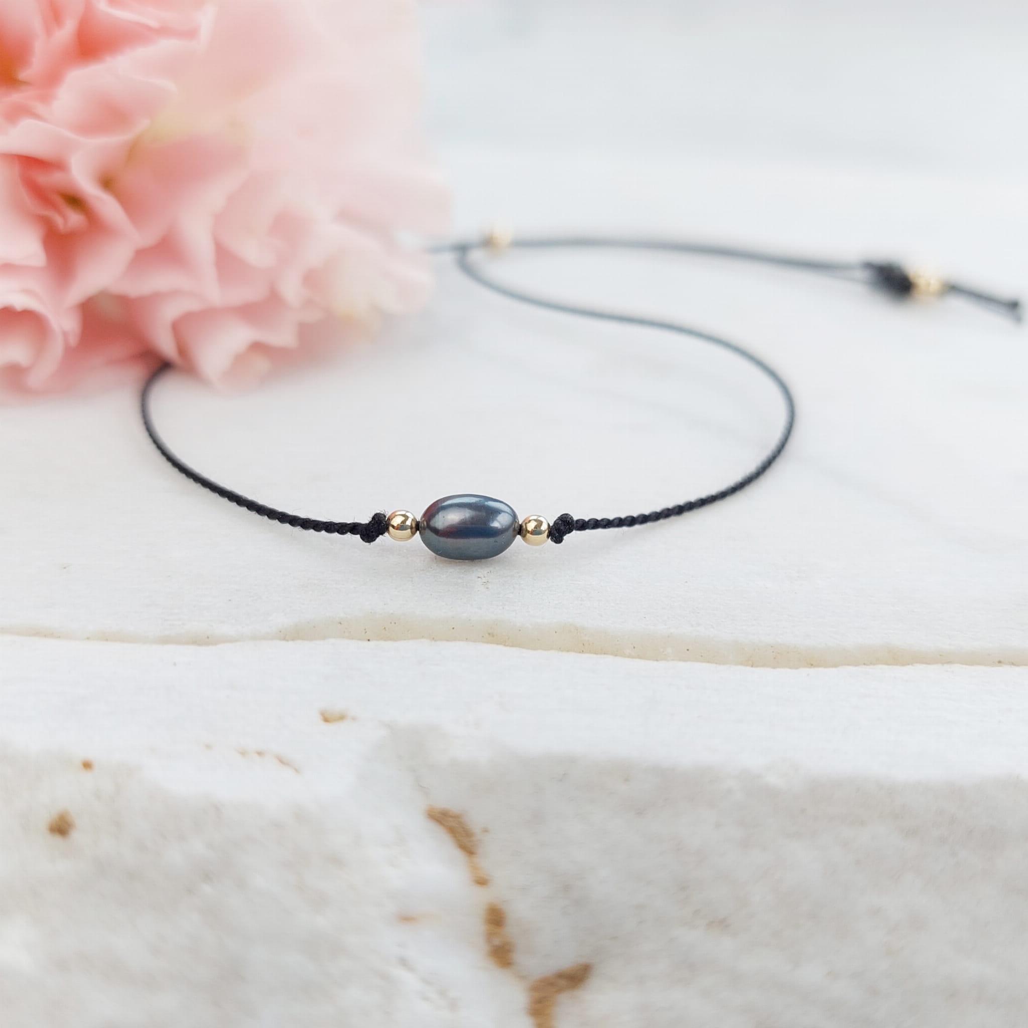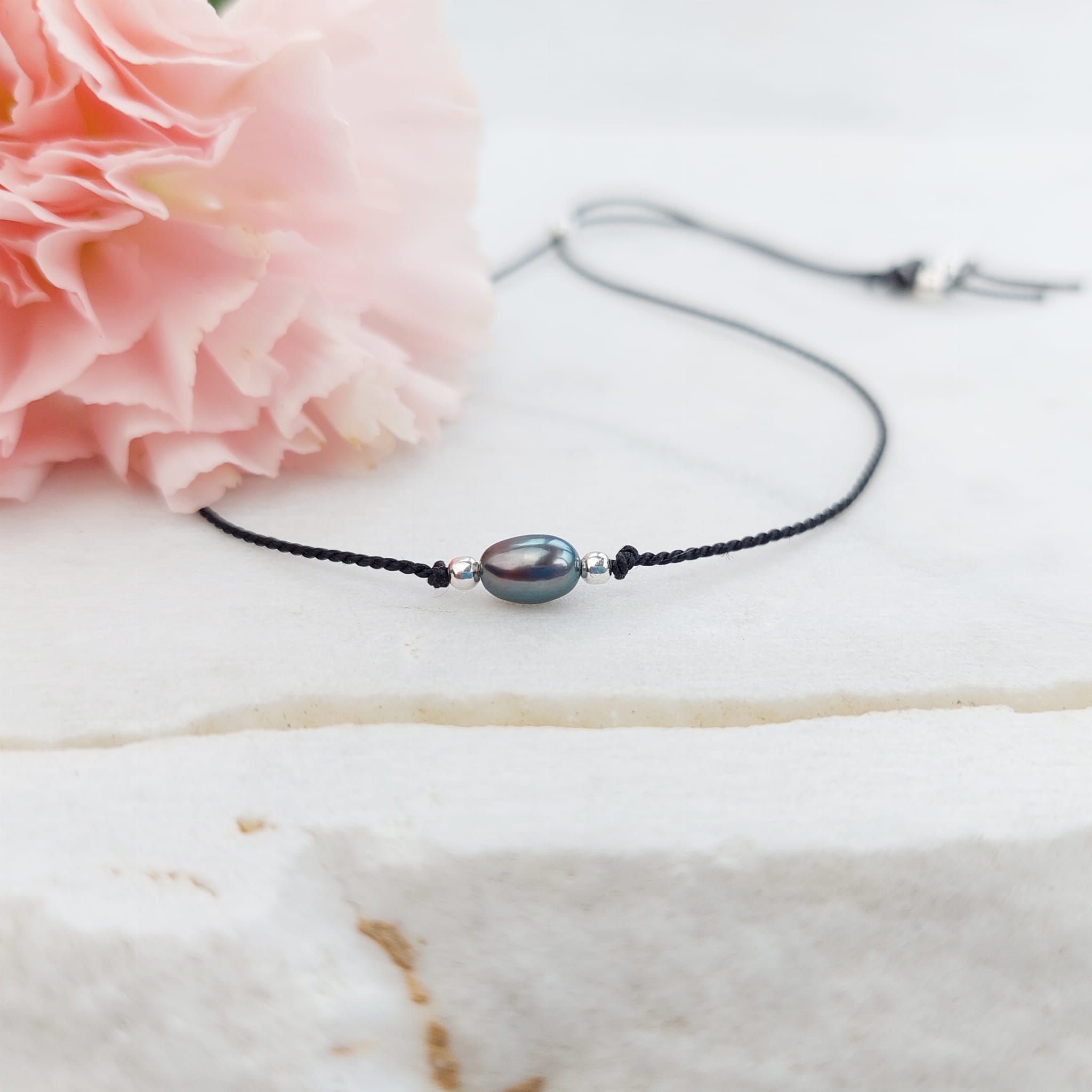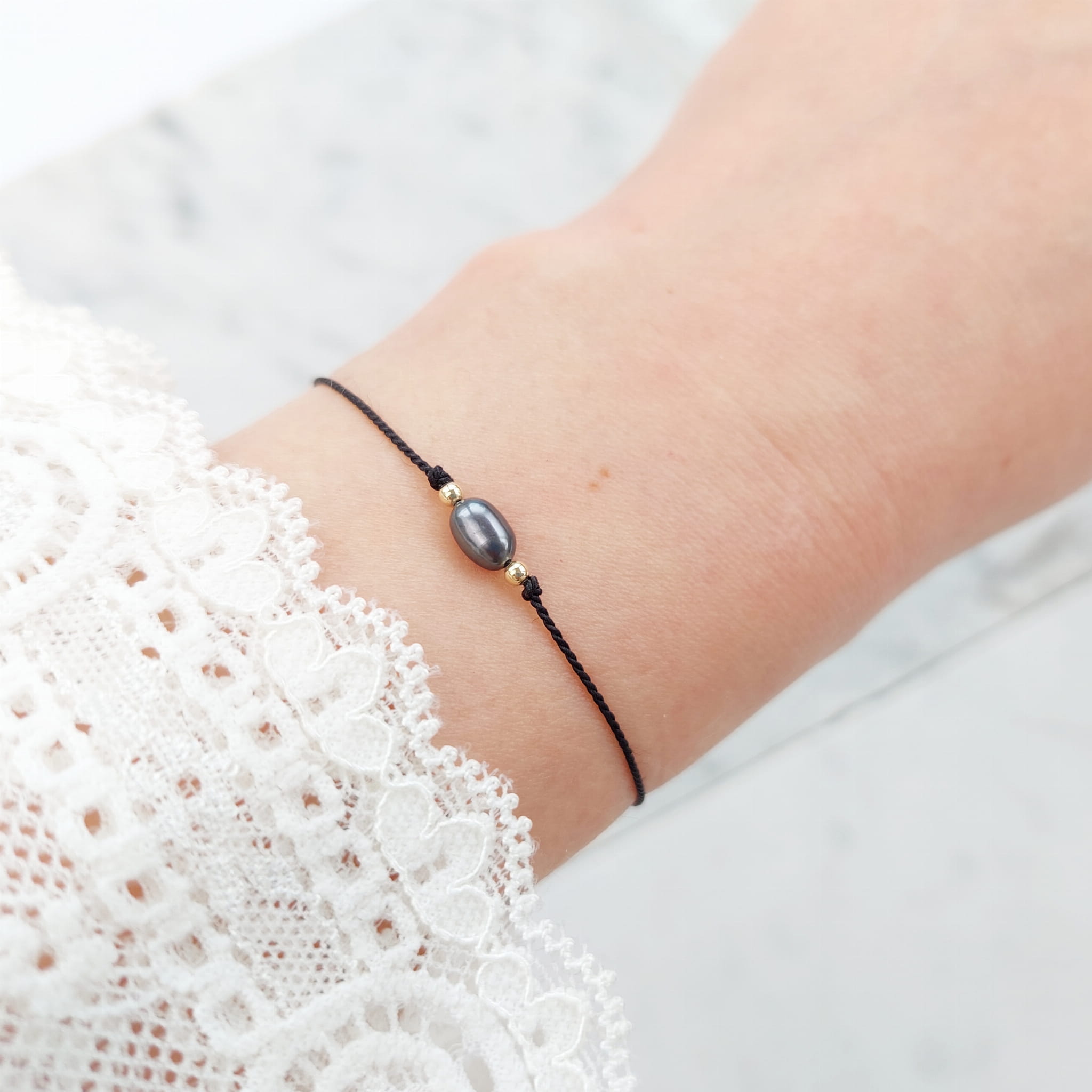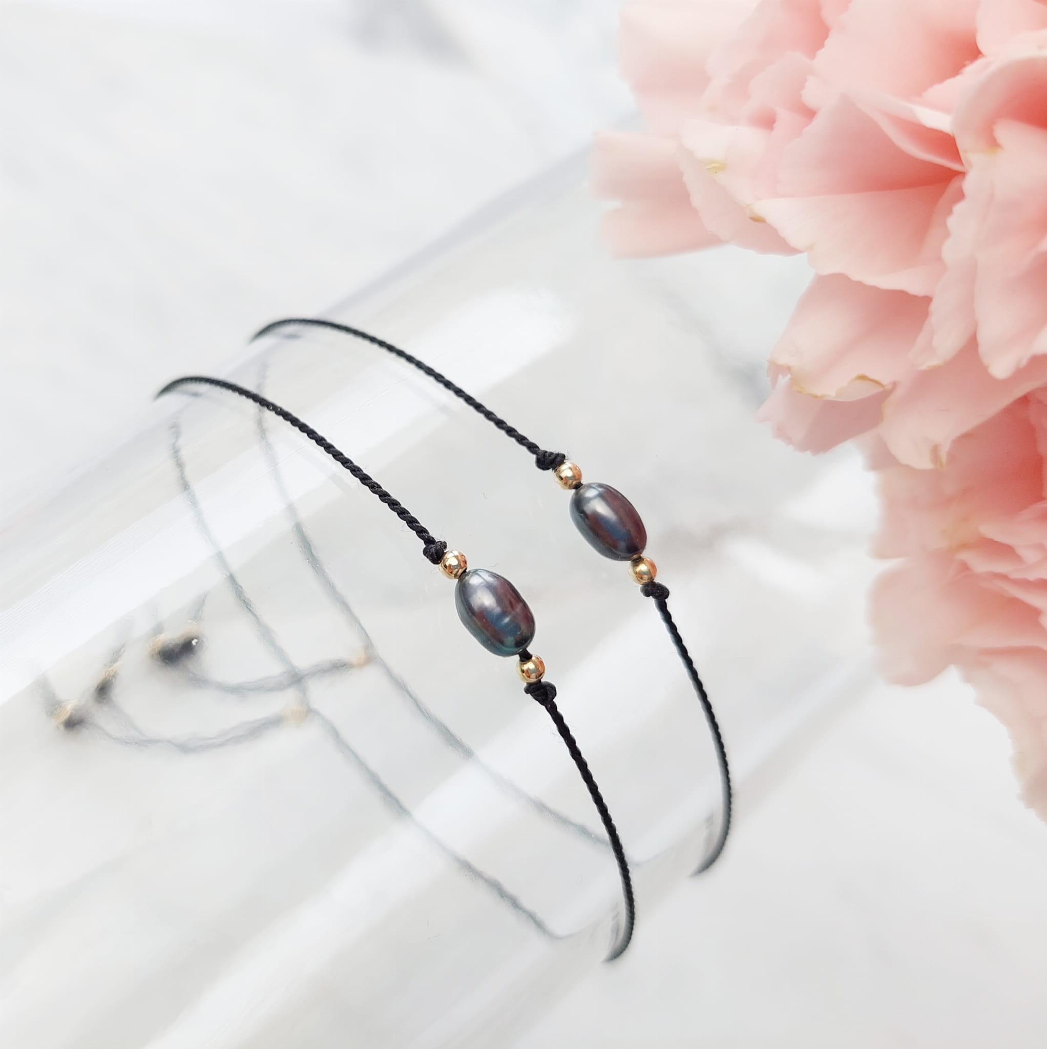 Komplet delikatnych bransoletek z perełkami dla Mamy i Córki. Pojedyncze perełki na jedwabnym sznureczku z zapięciem regulowanym silikonowym stoperem.