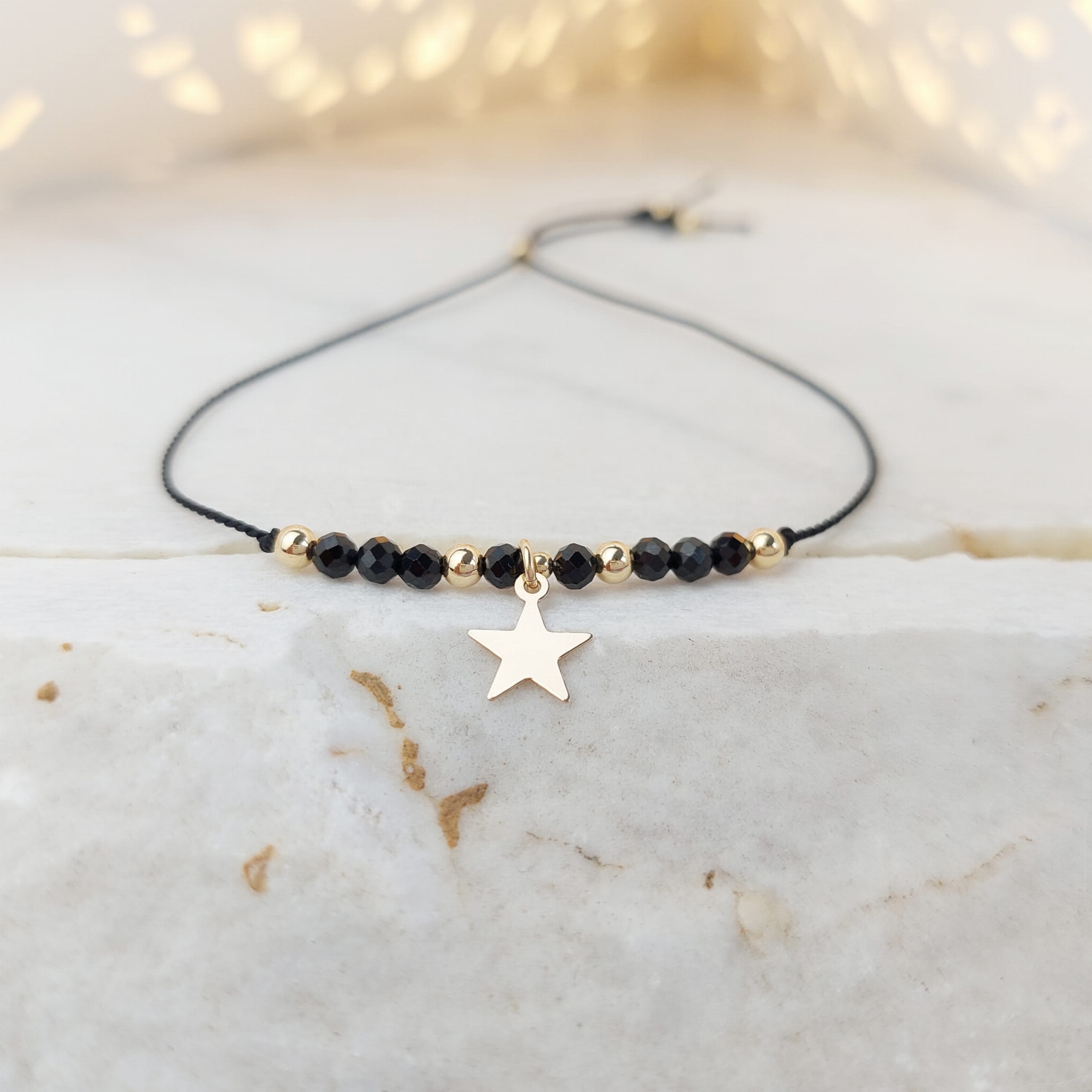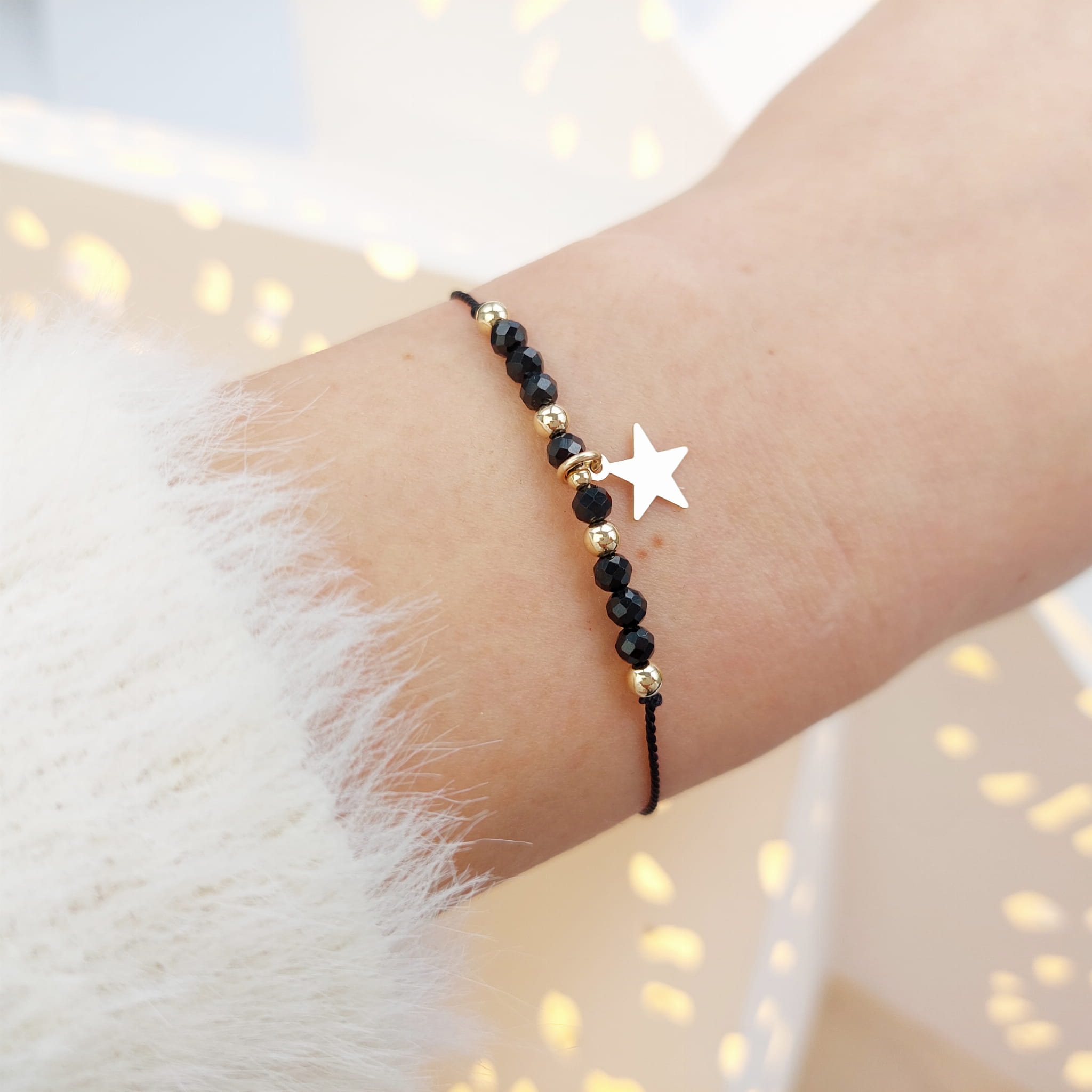 Bransoletka wykonana jest z czarnego spinela, złota goldfilled lub srebra próby 925.