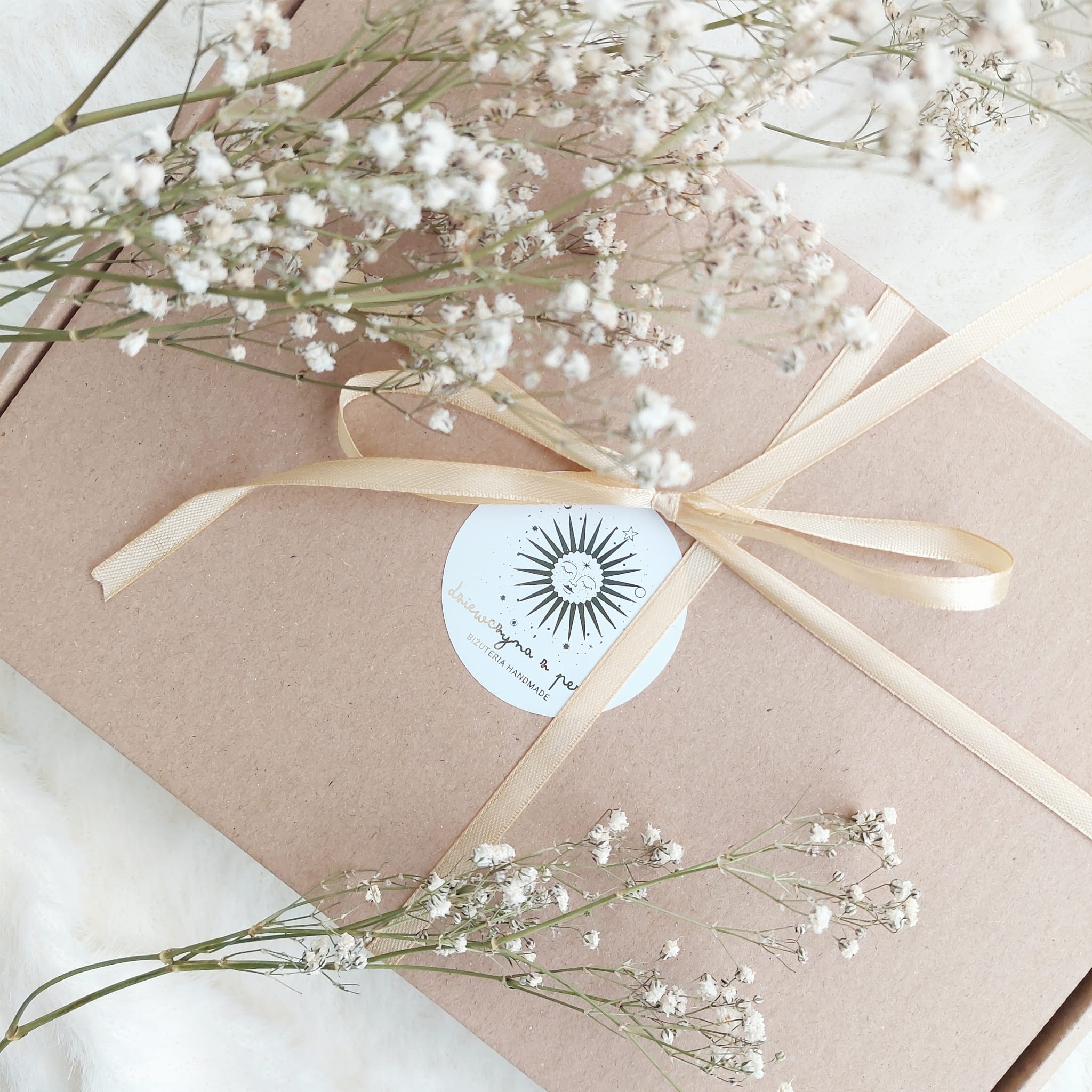 Bransoletki zapakowane w ozdobne pudełeczko owinięte w złotą bibułkę. Całość jest umieszczona w kolejnym pudełeczku obwiązanym złotą wstążką. Radość podczas rozpakowywania gwarantowana:)