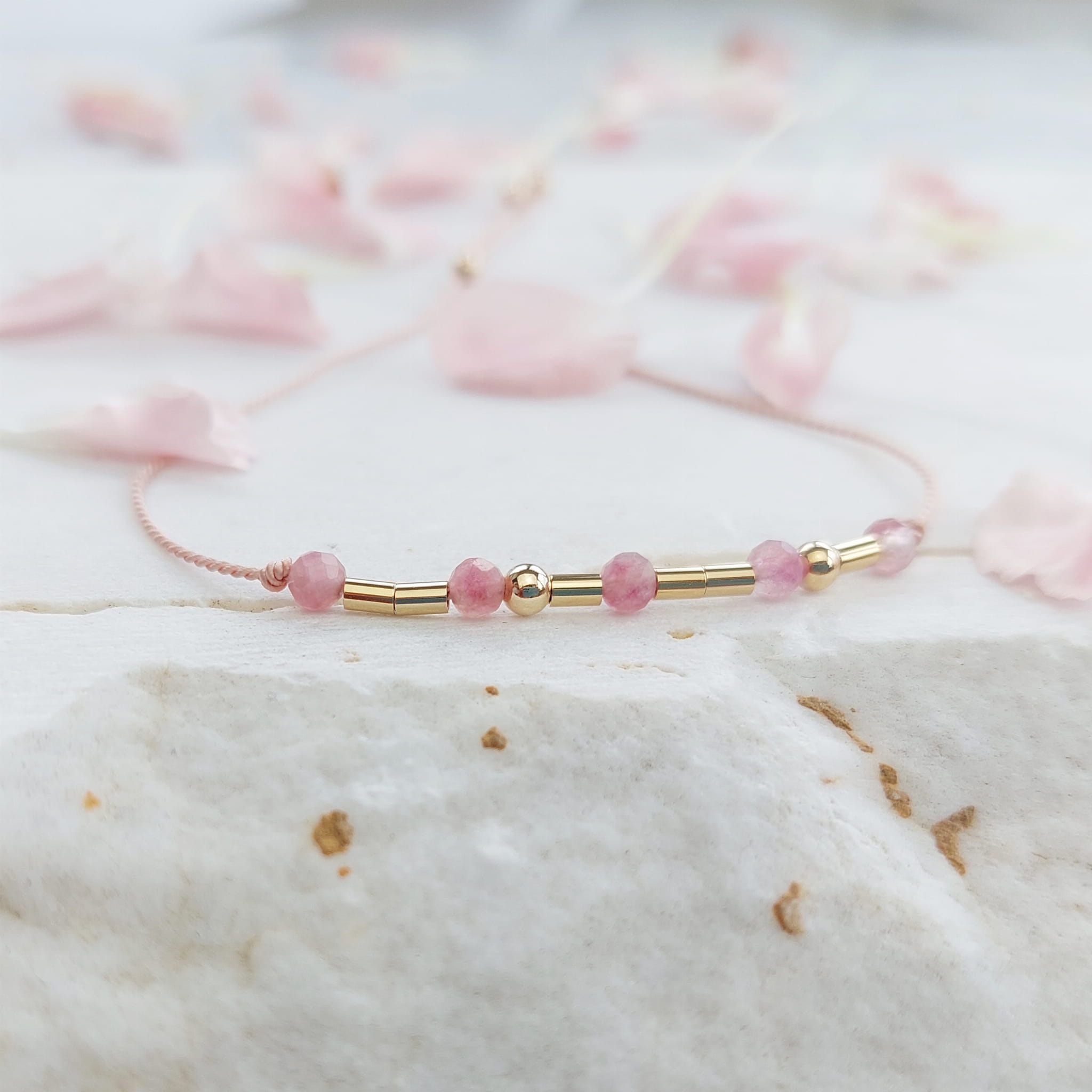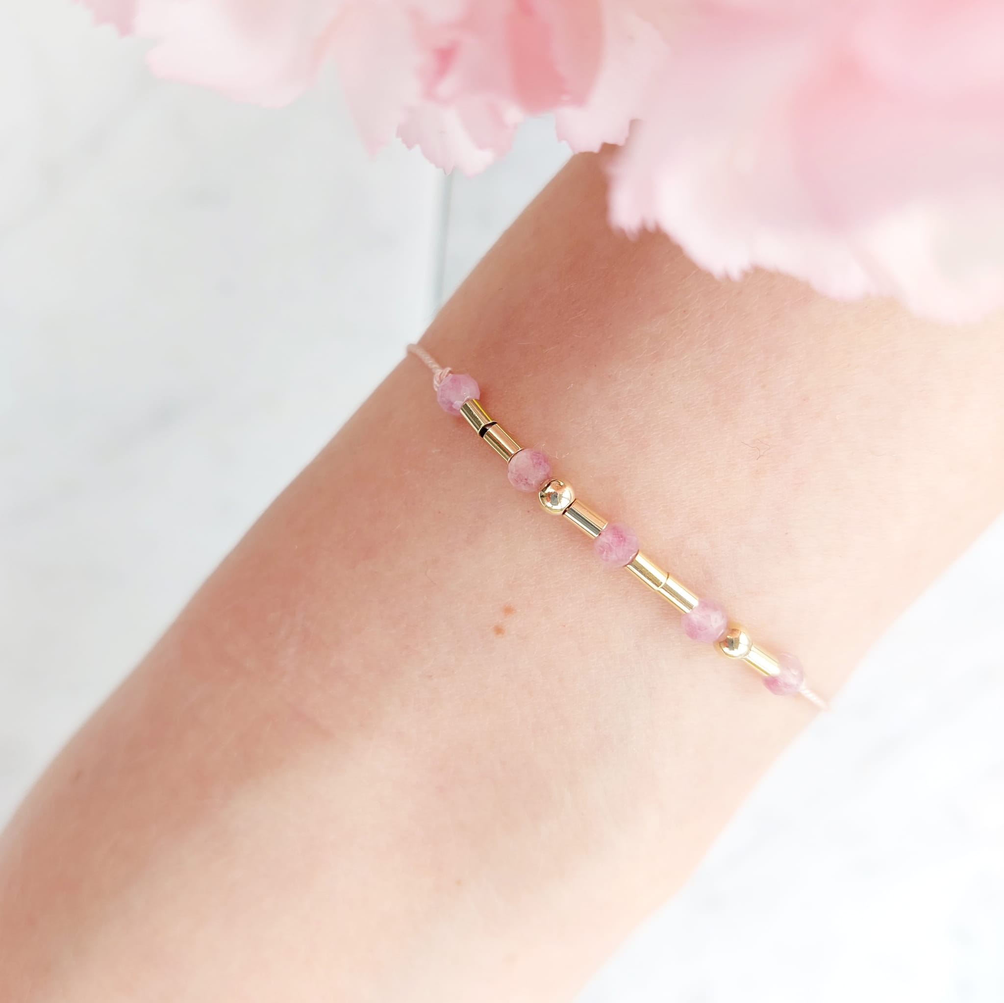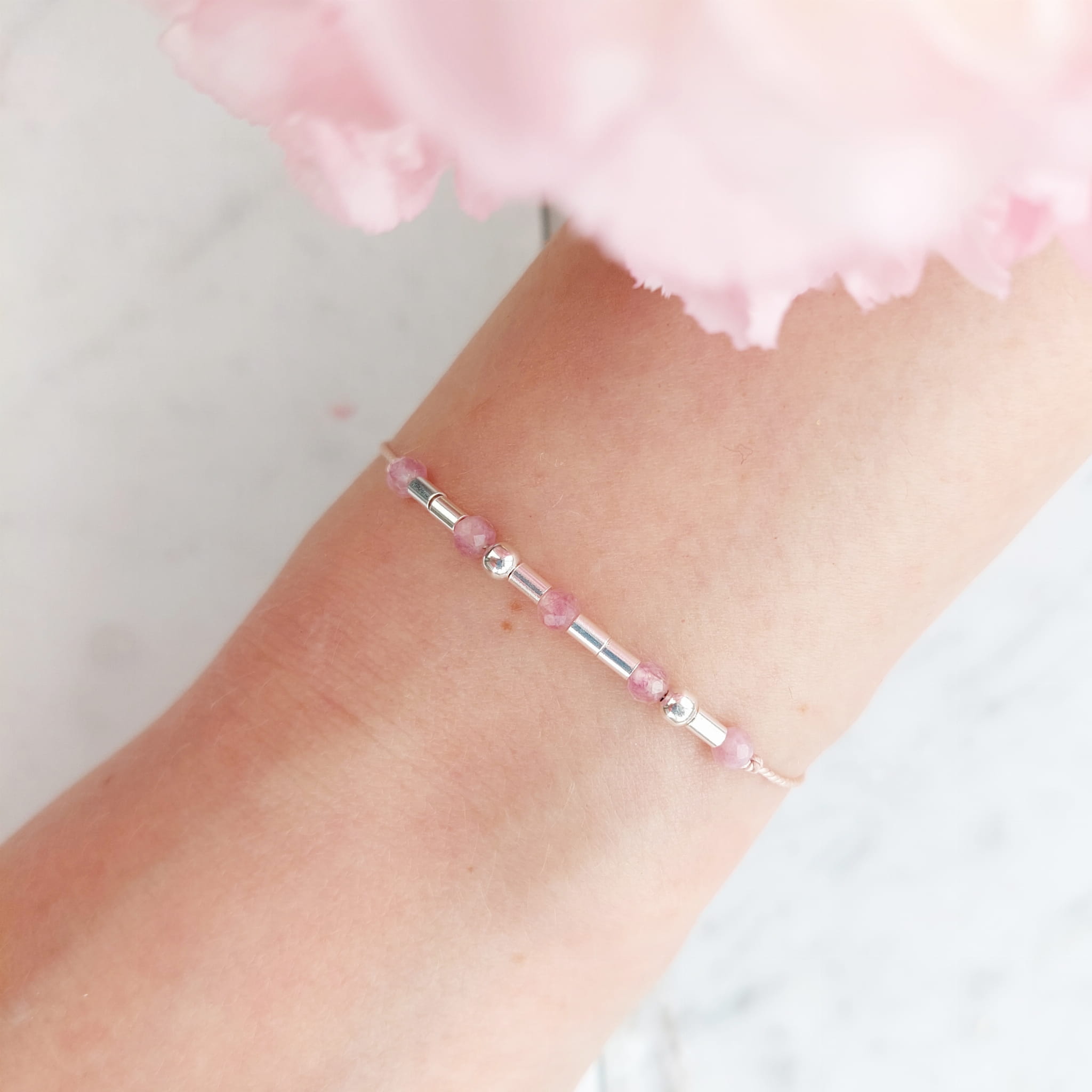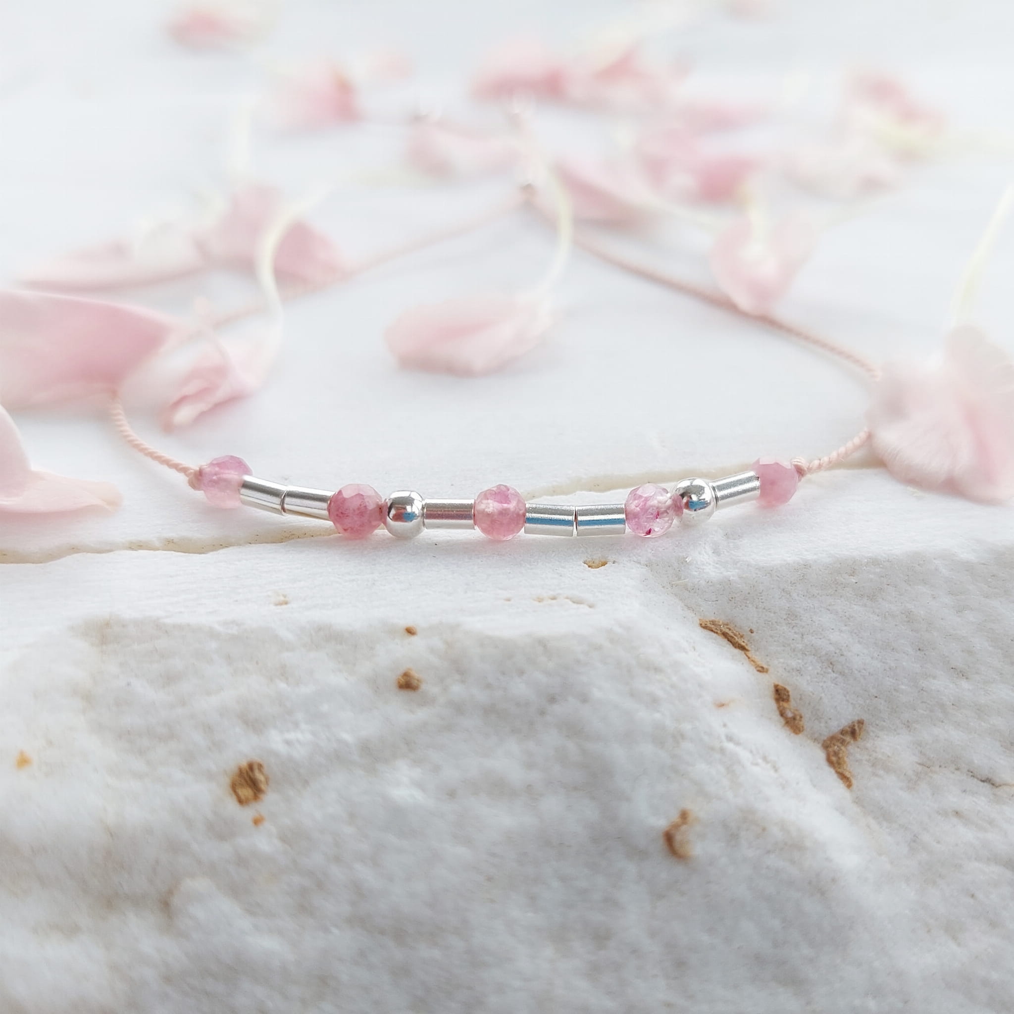 Minimalistyczna, delikatna bransoletka na jedwabnej nici z elementami ze srebra próby 925 lub złota goldfilled oraz naturalnych kamieni turmalinu różowego.