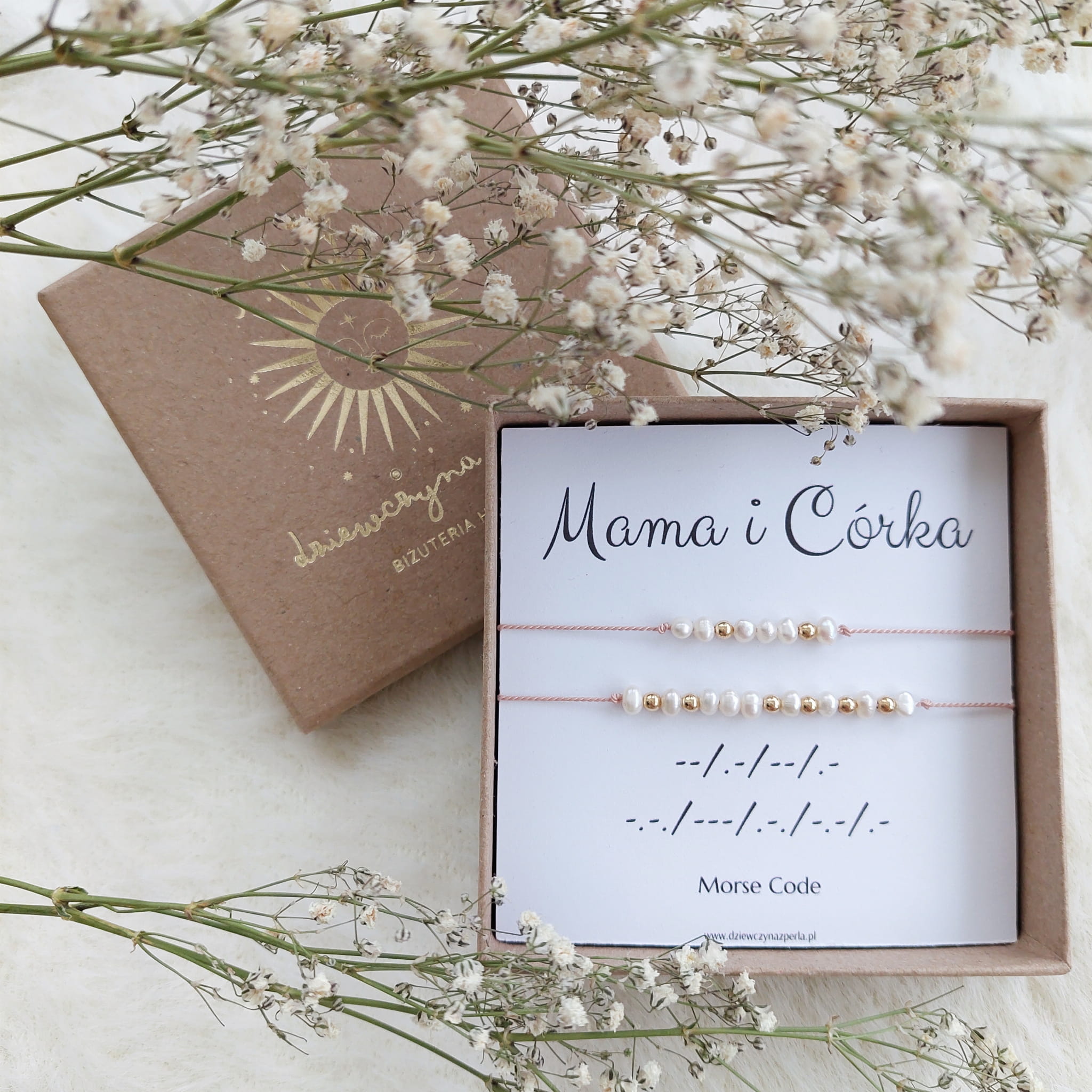 Bransoletki ukrywają zakodowane słowa: MAMA (1 bransoletka) i CÓRKA (2 bransoletki) zapisane alfabetem Morse'a. Idealna jako prezent dla Mamy.