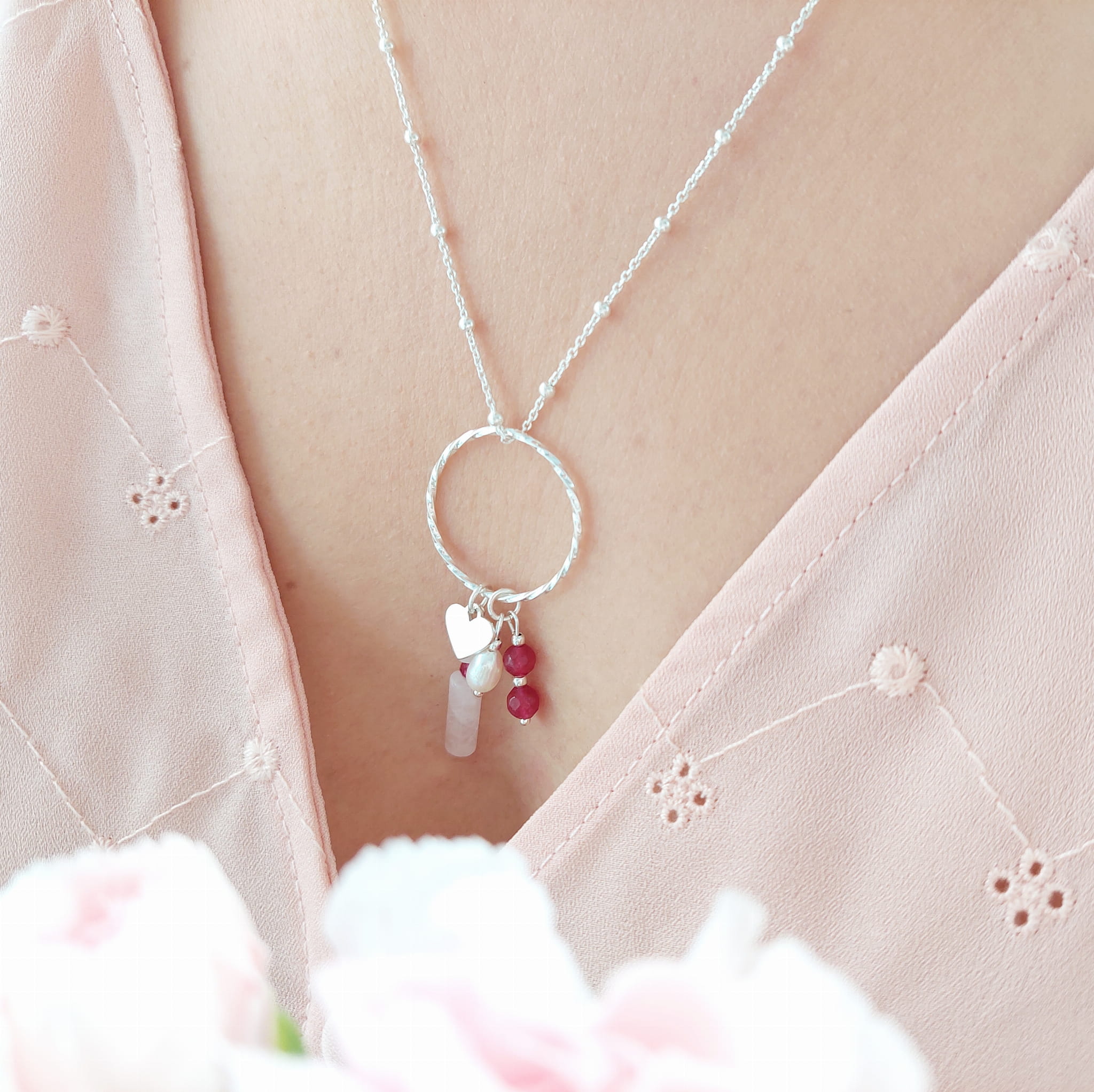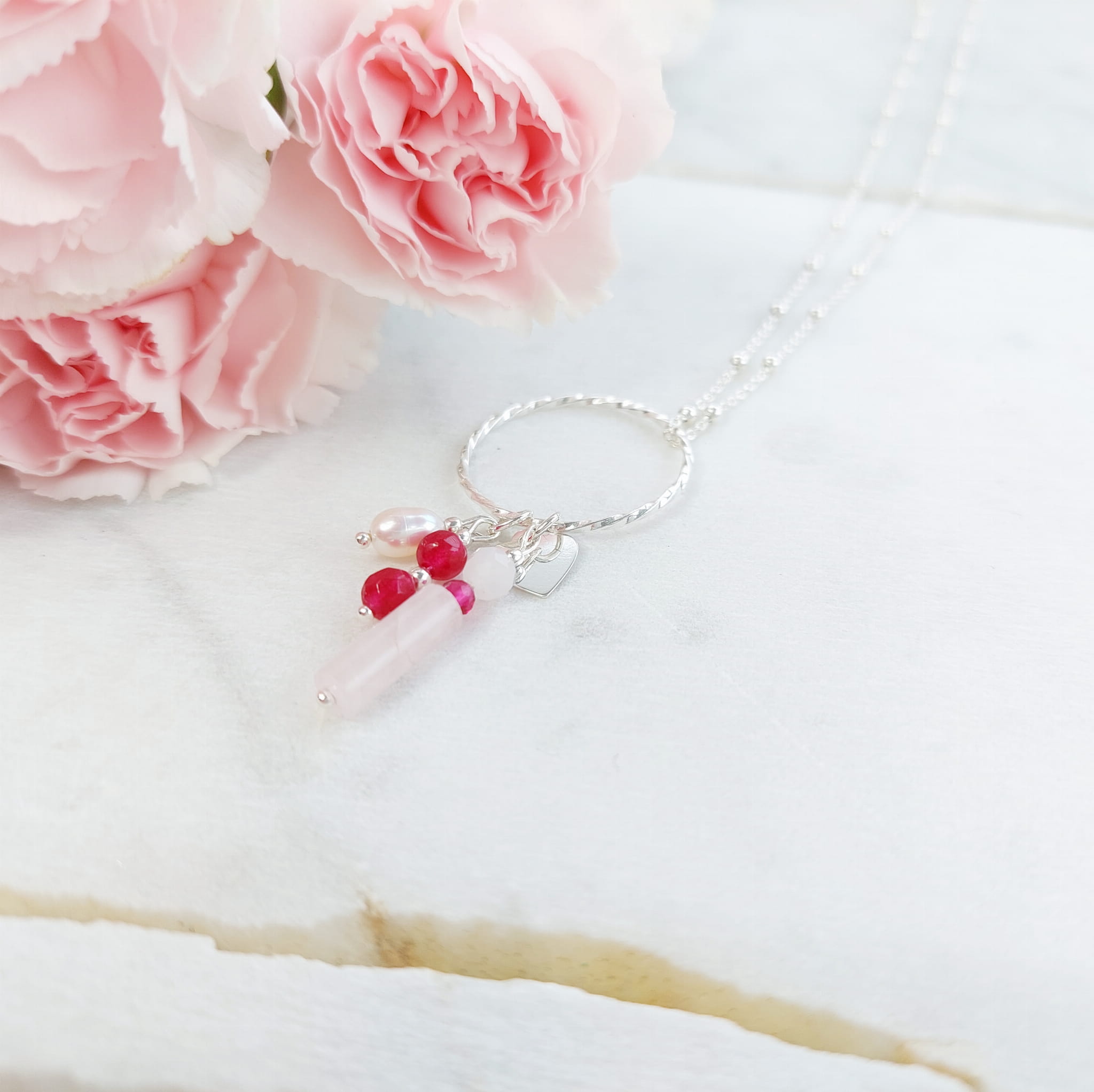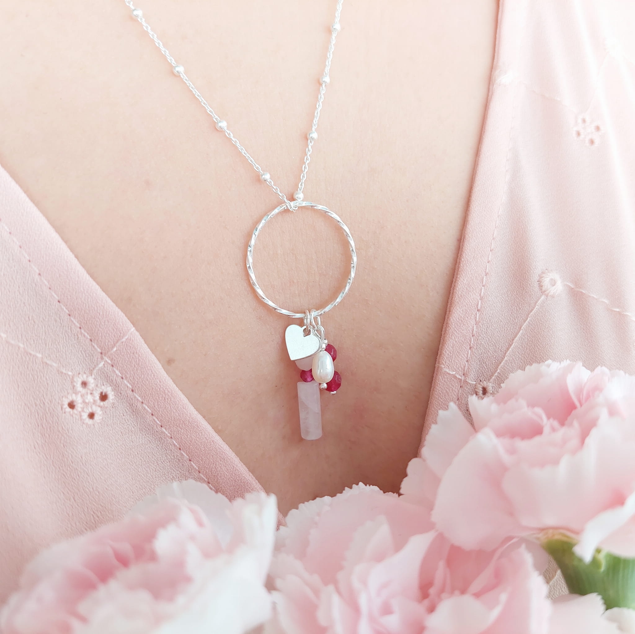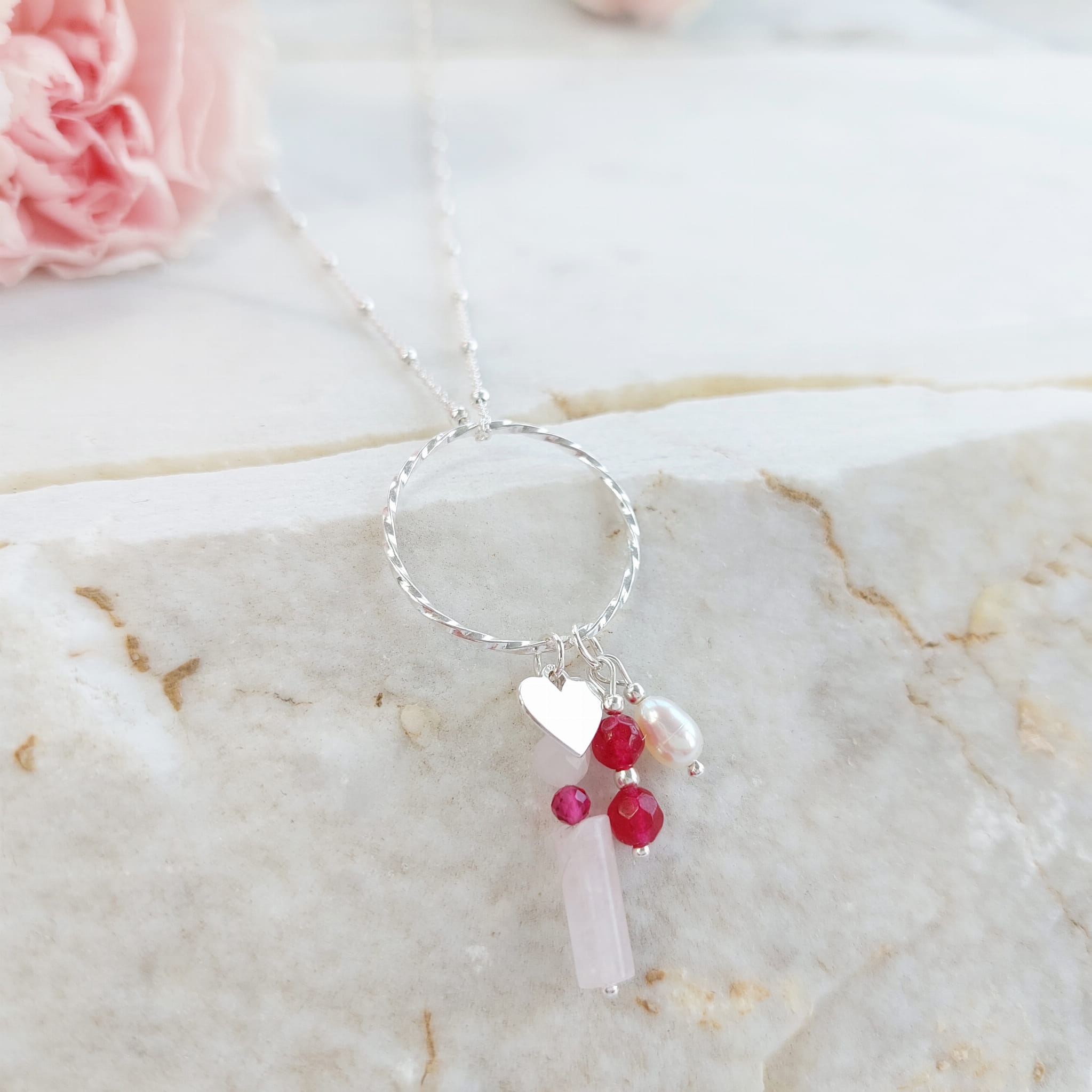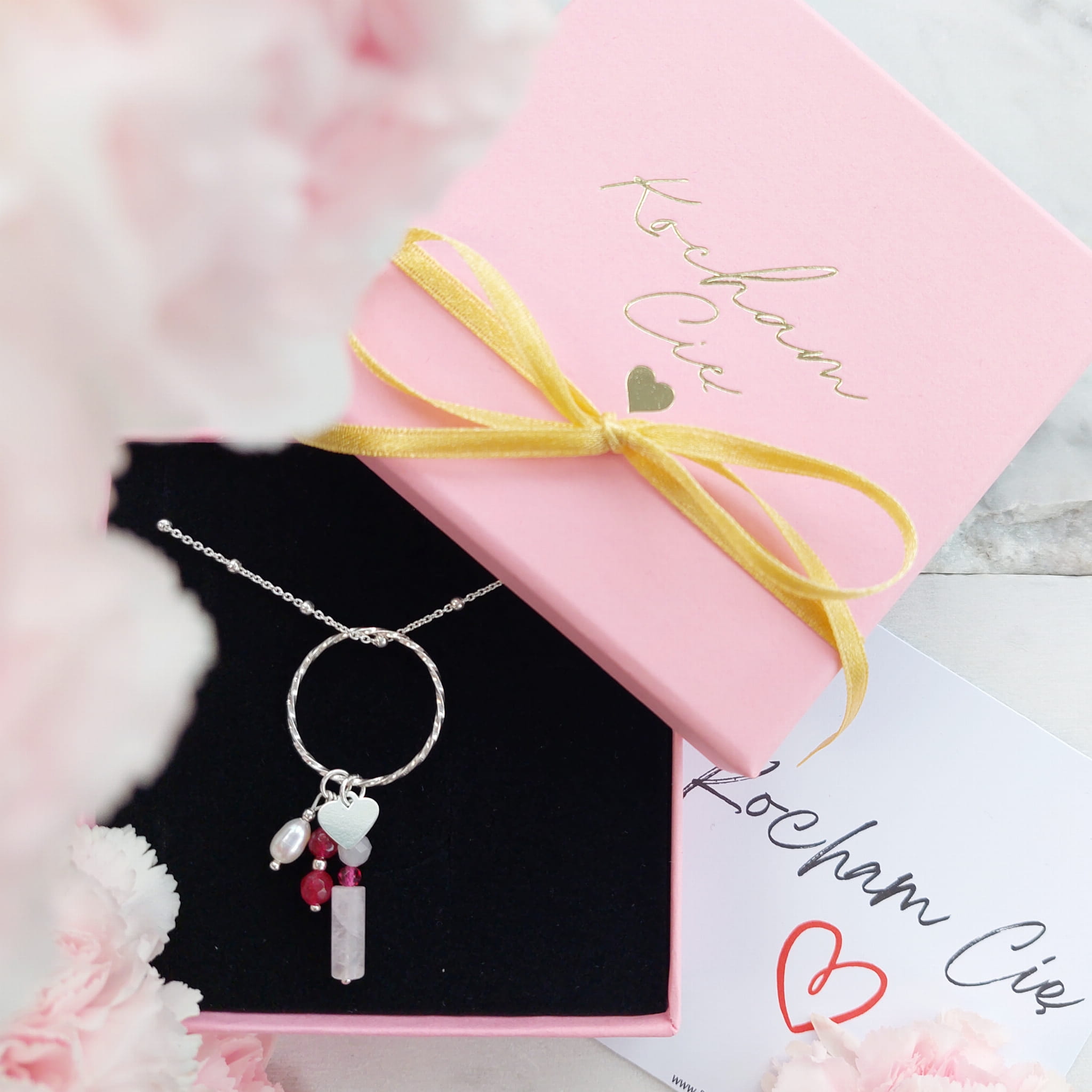 Naszyjnik MIŁOŚĆ. Prezent na Walentynki. Perła, Rubin, Kwarc Różowy, Srebro