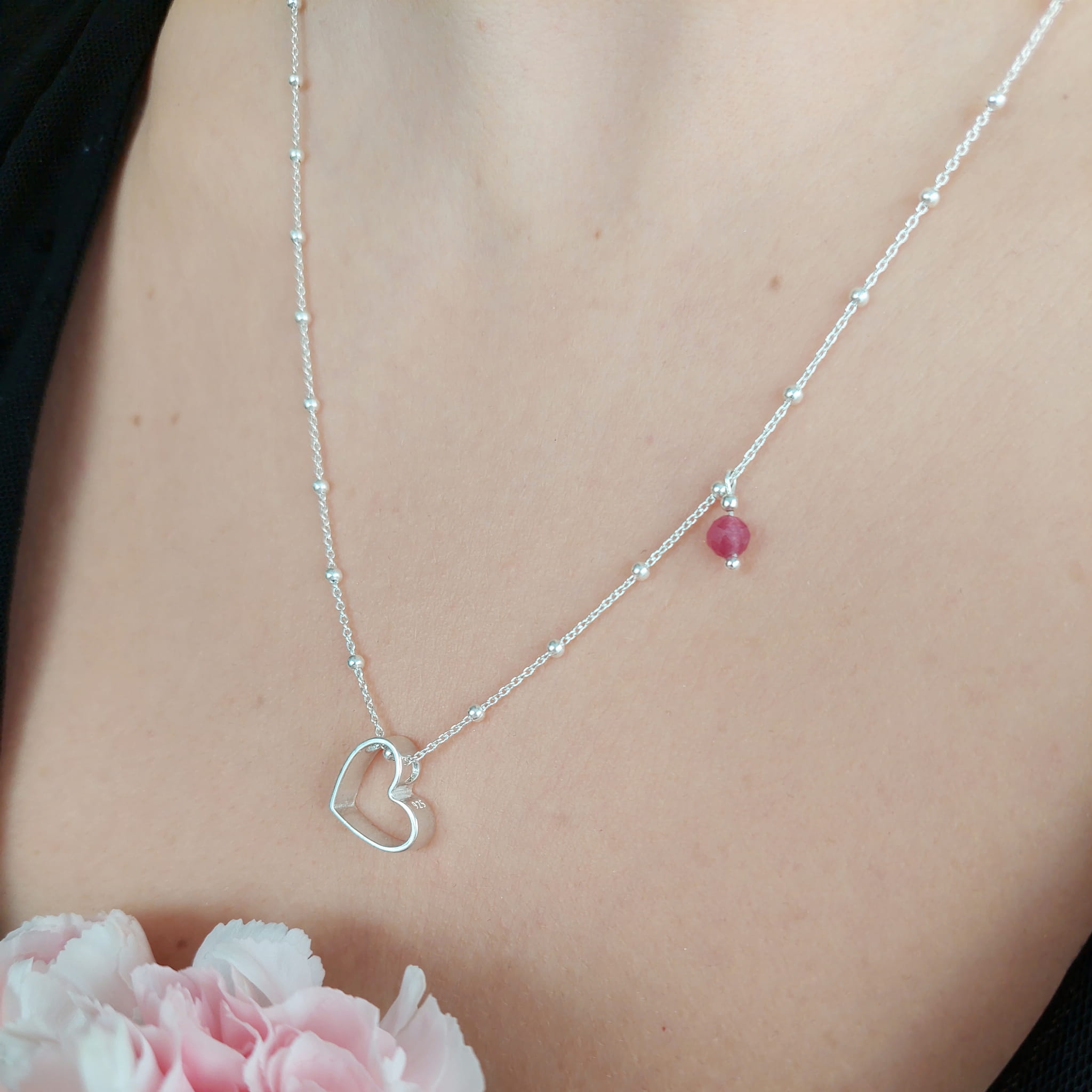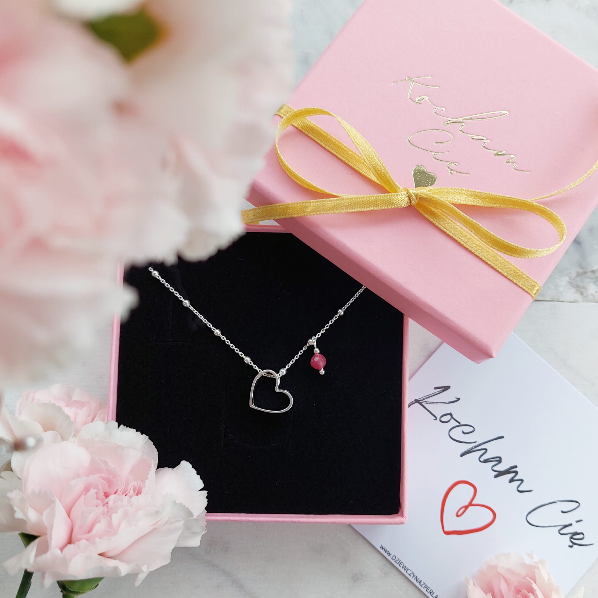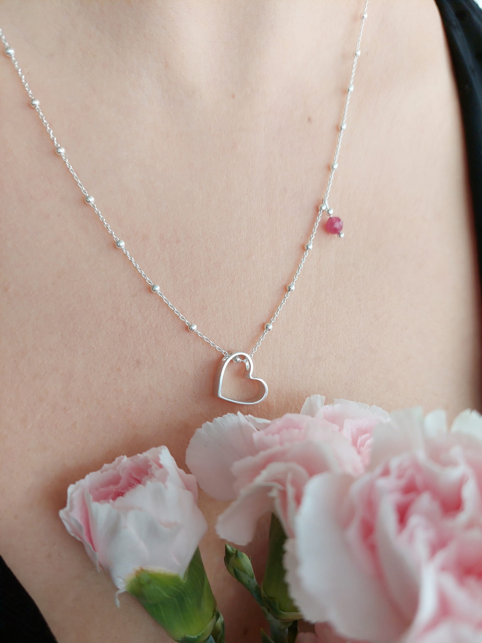 Piękny naszyjnik z dużym sercem i zawieszką z turmalinu różowego.