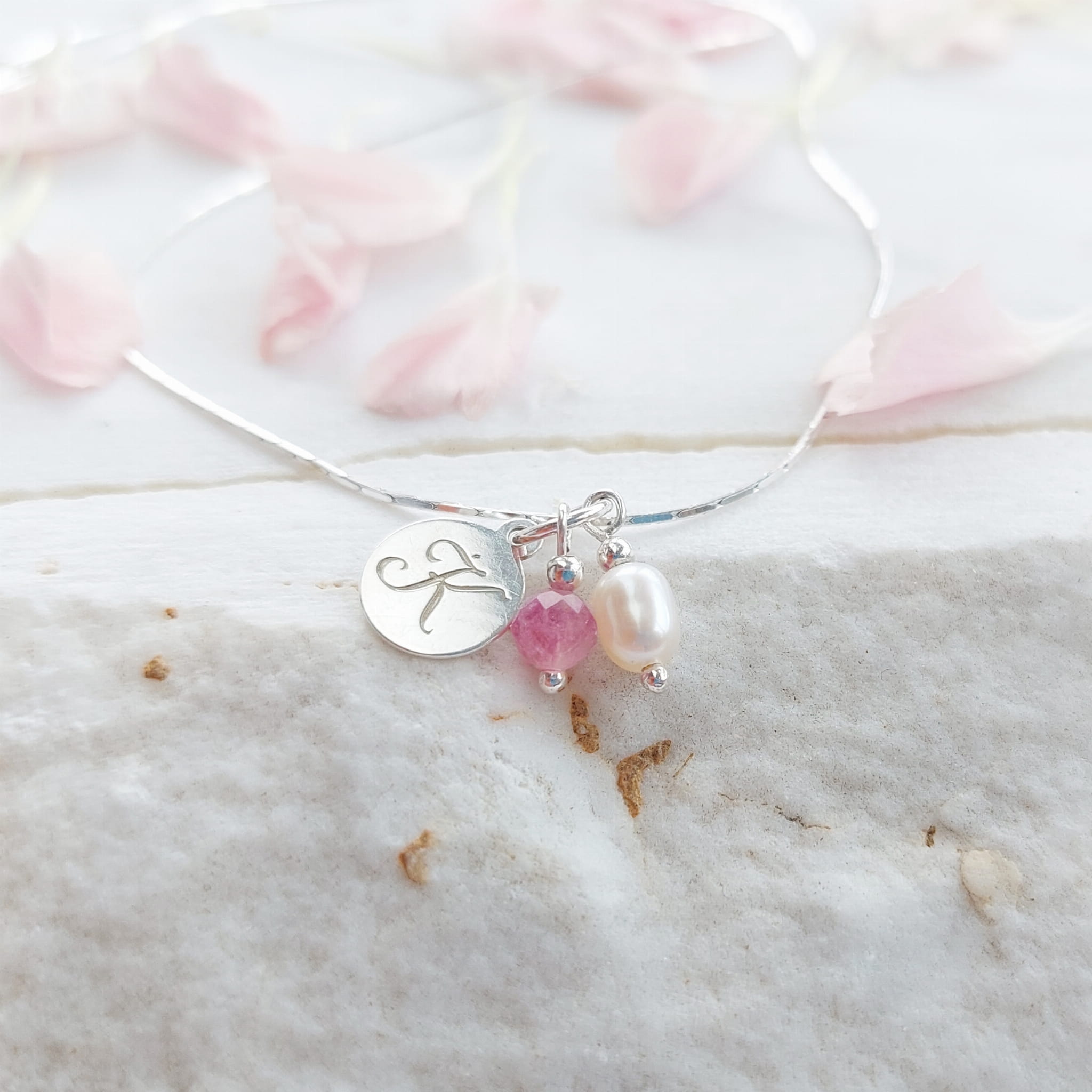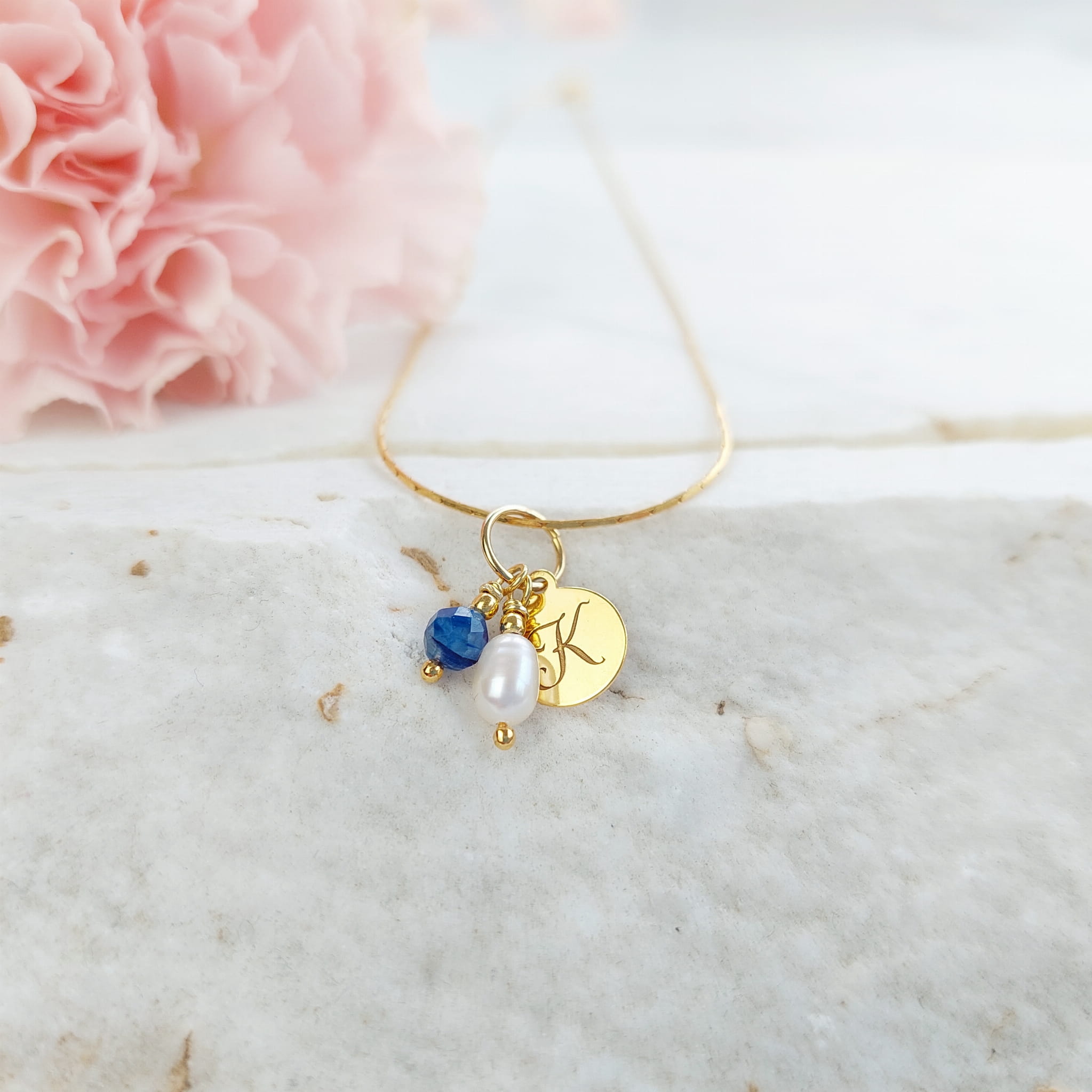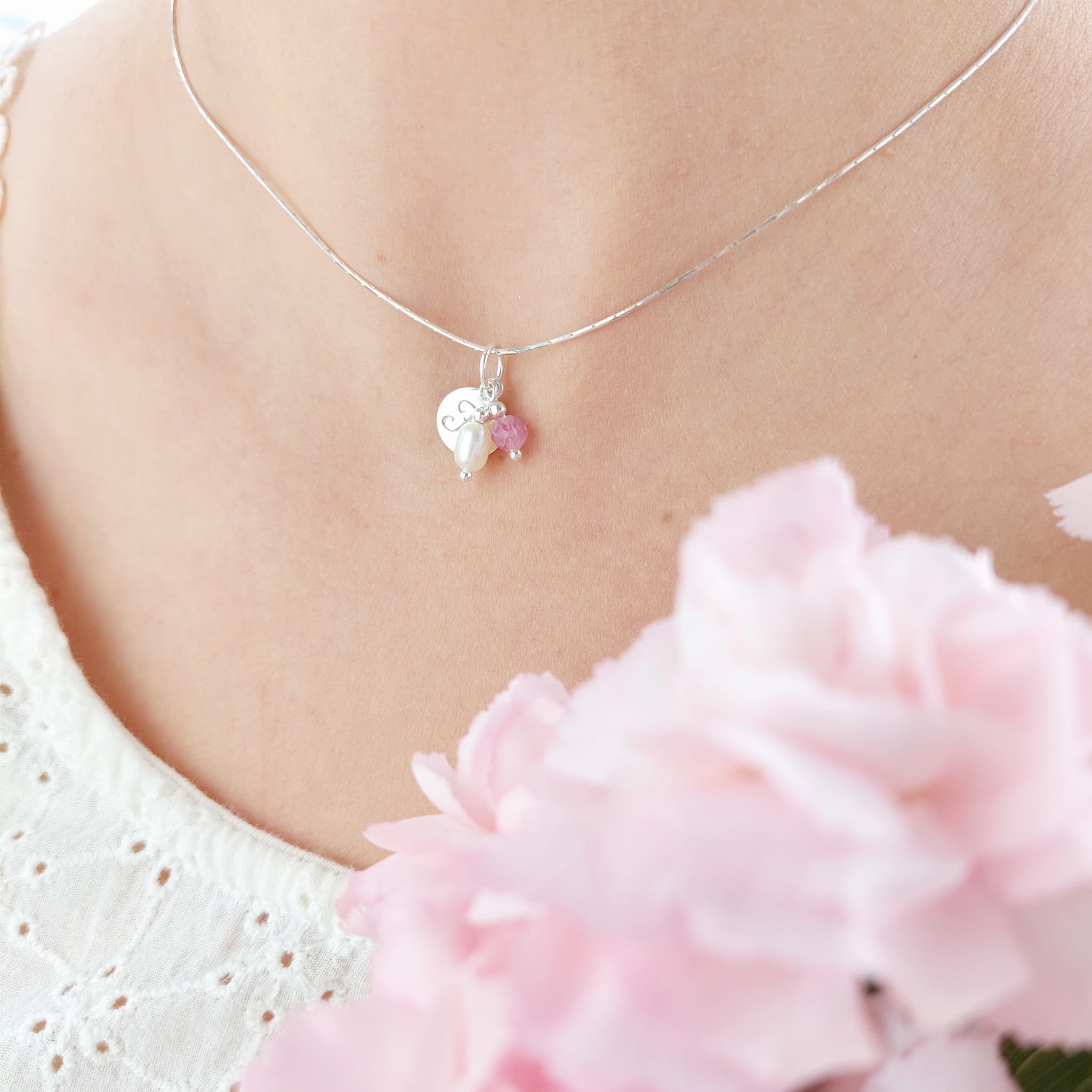 Naszyjnik z inicjałem, perłą i kamieniem urodzeniowym.