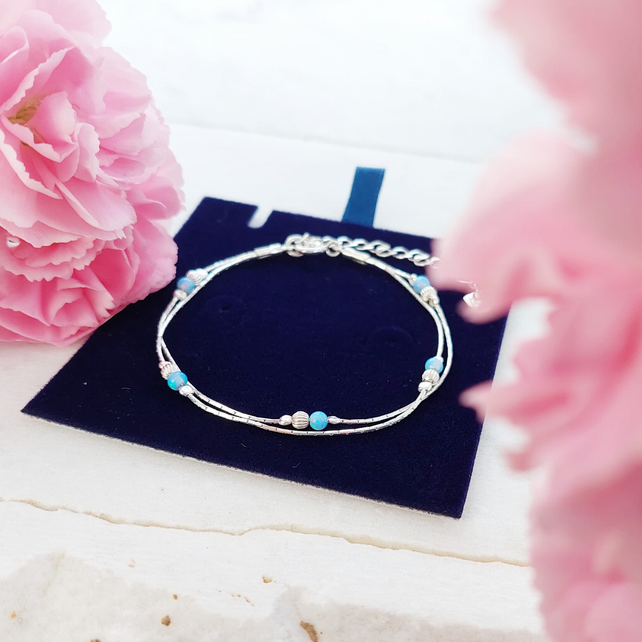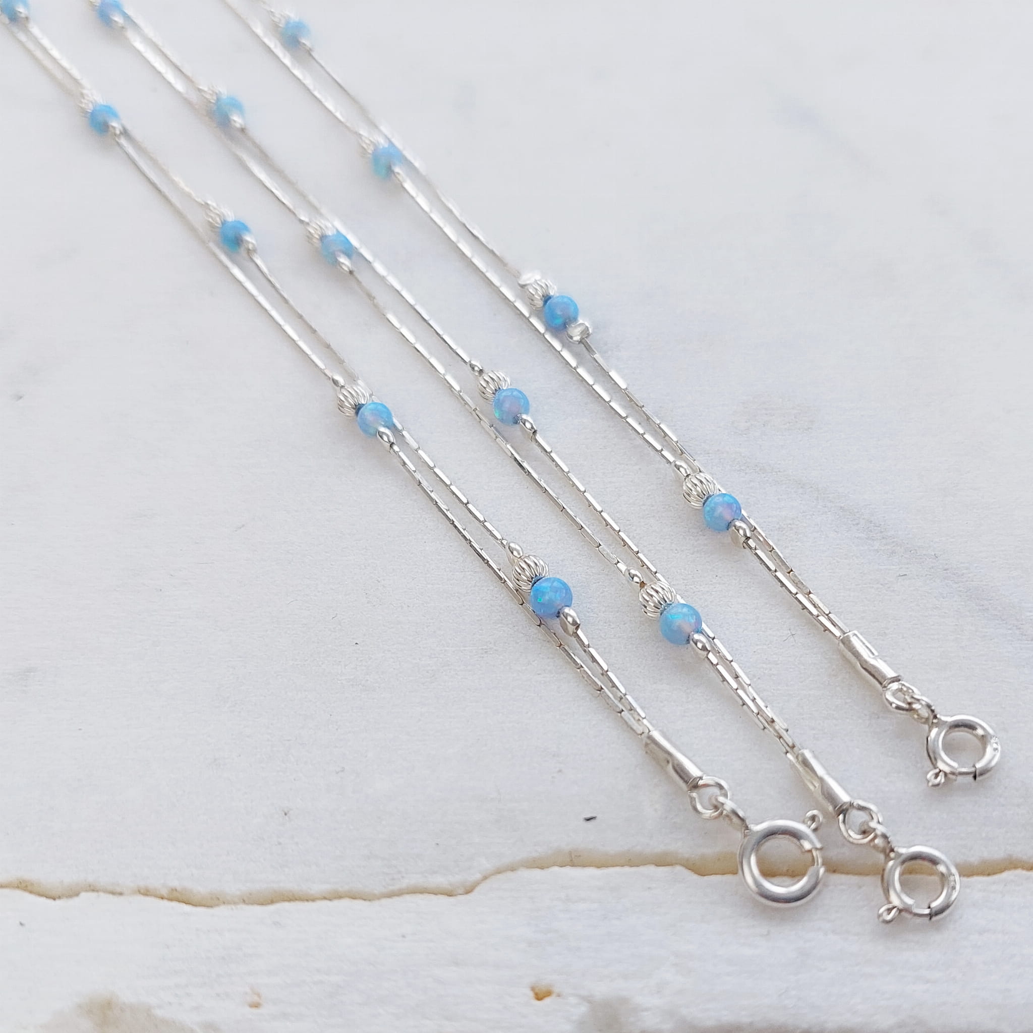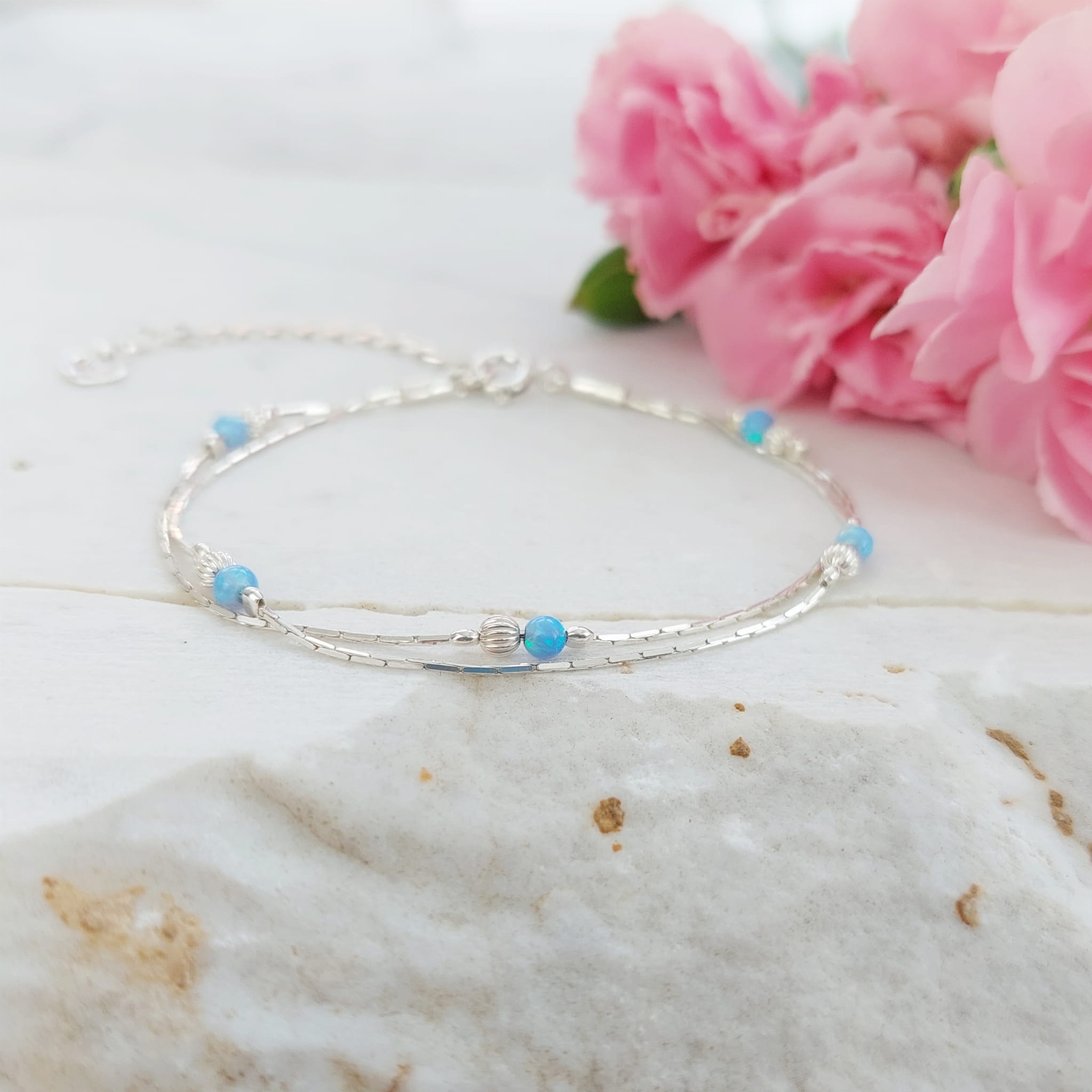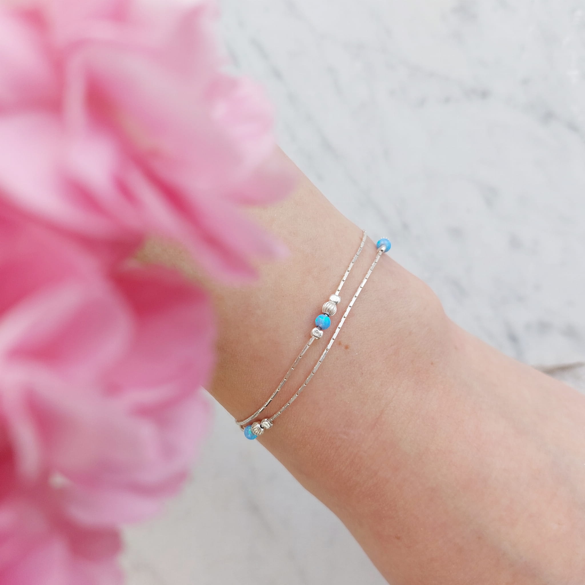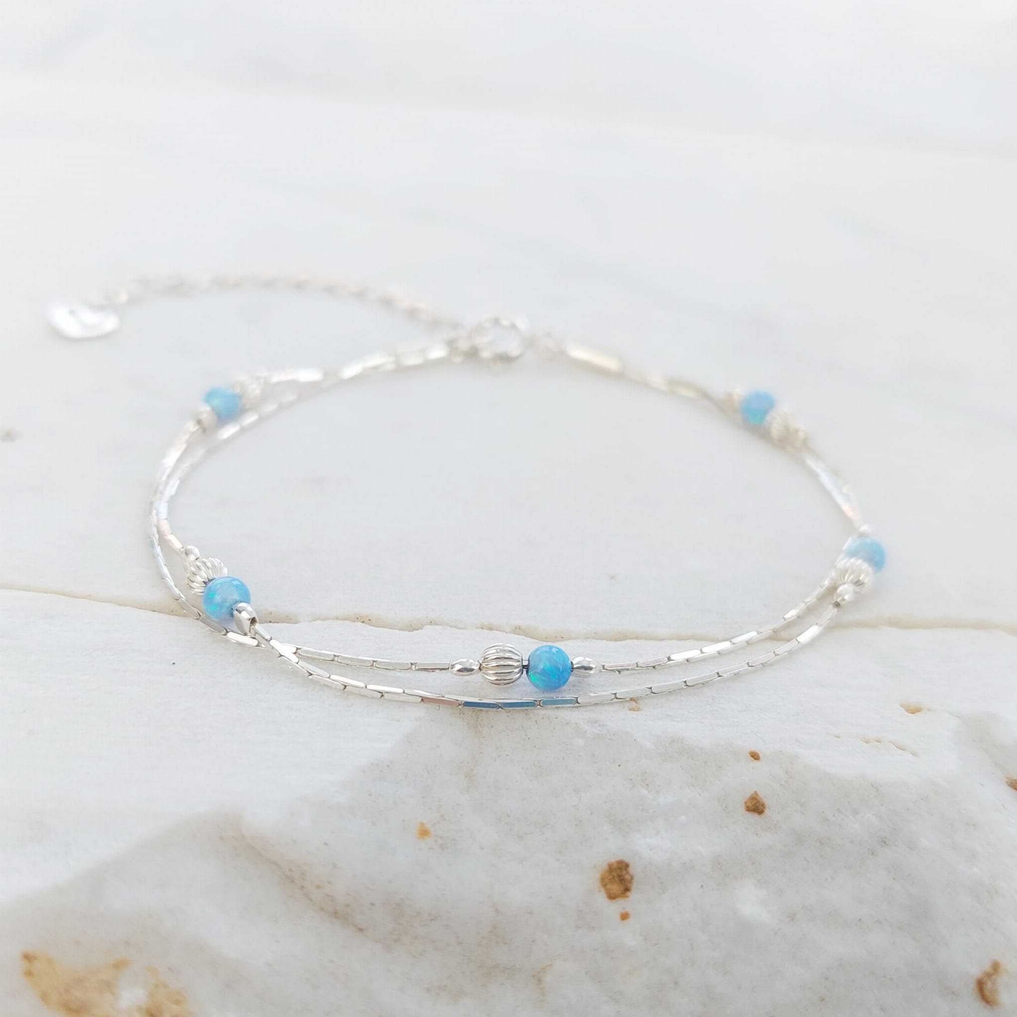 Minimalistyczna, delikatna bransoletka na podwójnym srebrnym łańcuszku ozdobiona Opalem Australijskim i srebrnymi kulkami.