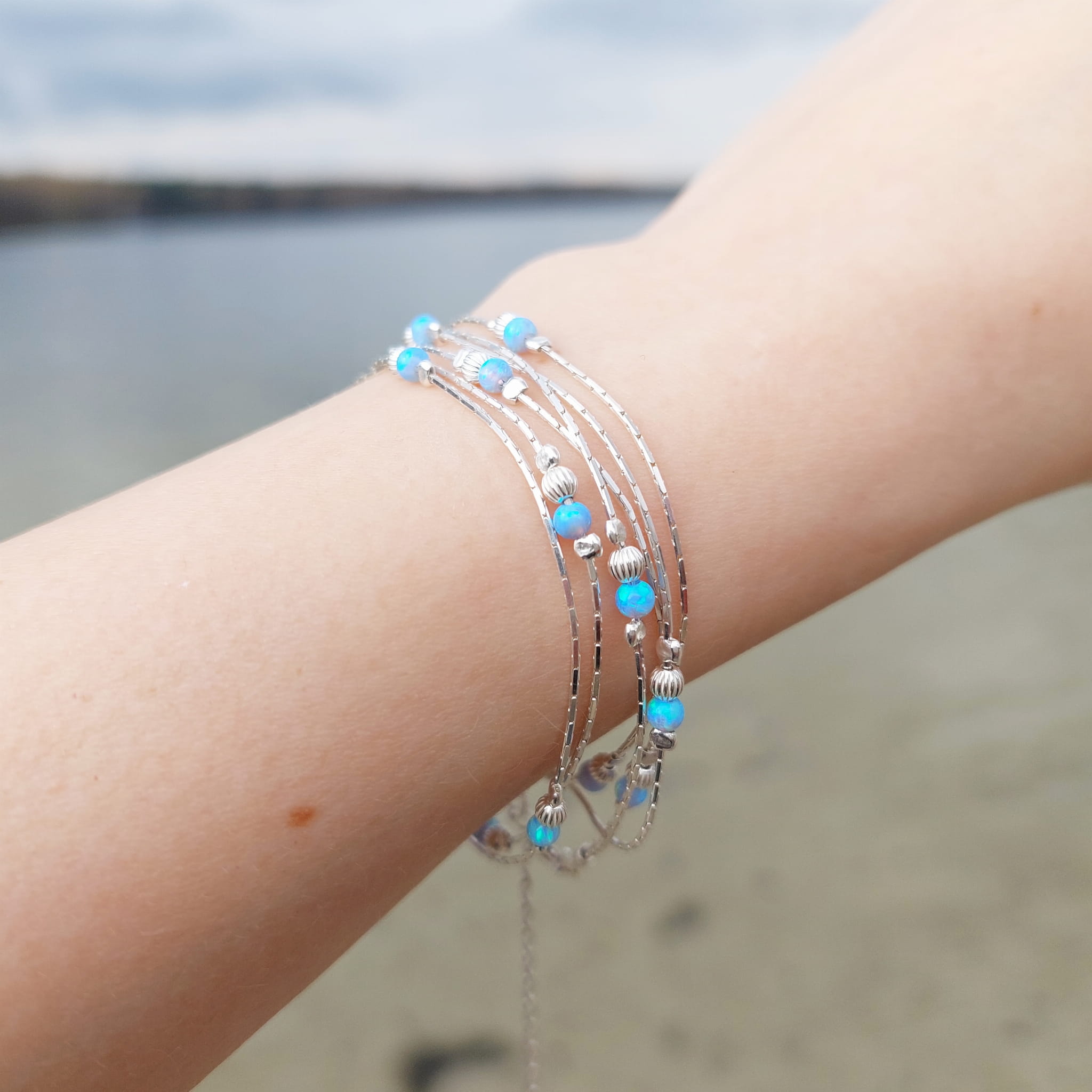Bransoletka wykonana ręcznie ze srebra próby 925 i Opalu Australijskiego który charakteryzuje się wspaniałą grą kolorów i wibrującymi skrzącymi drobinkami załamującymi światło. Zjawisko to nazywane jest opalescencją.