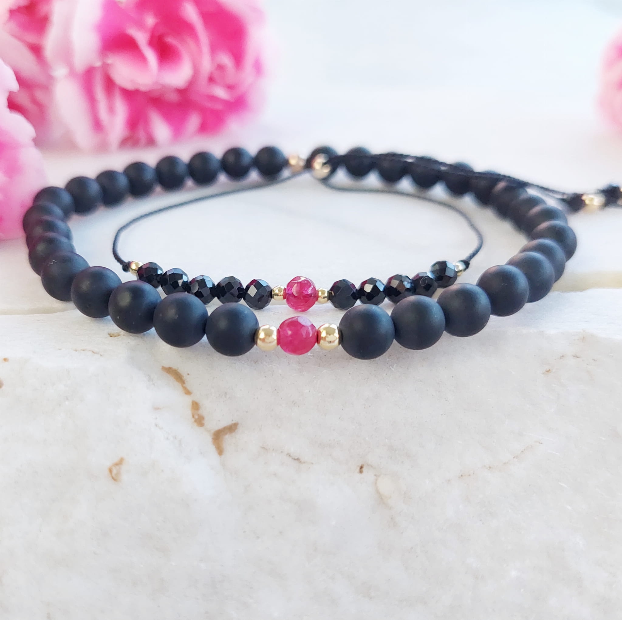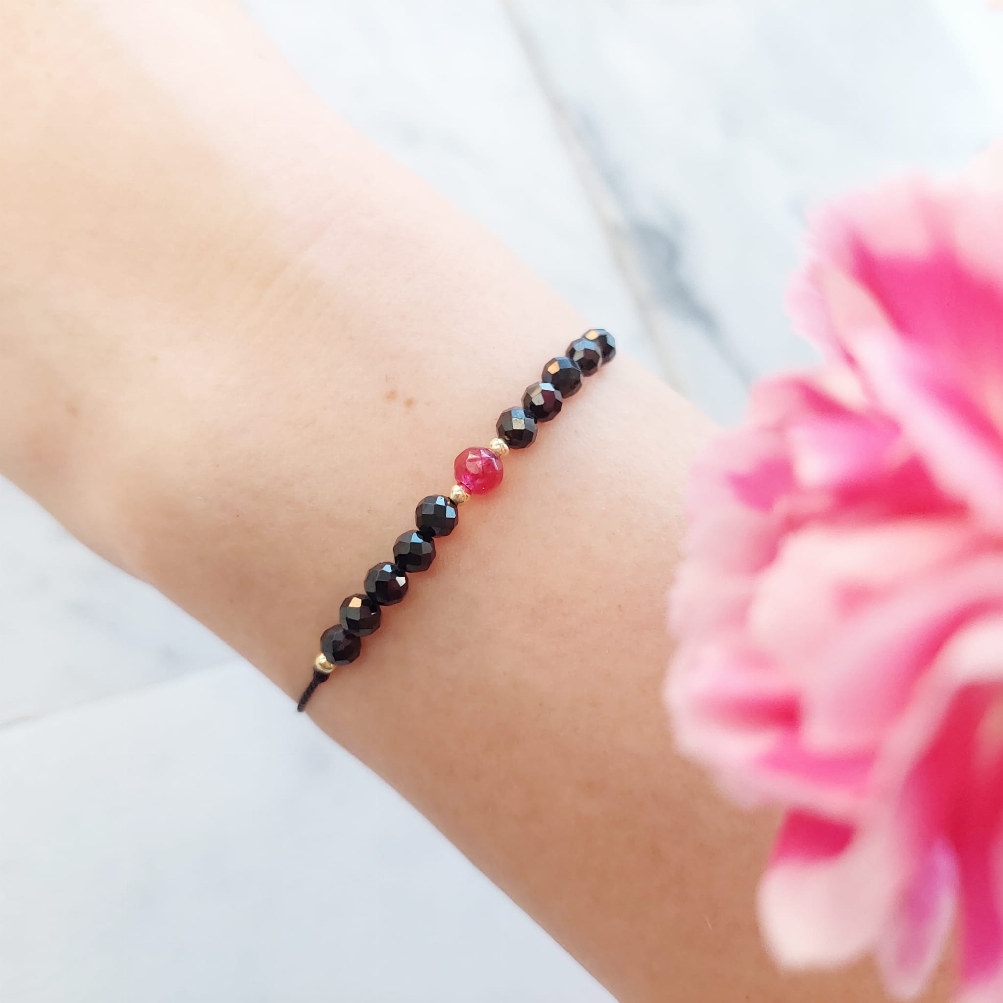 Materiał bransoletka damska: Jedwabny sznurek, Złoto Goldfilled, Srebro próby 925, kamień Rubin, Spinel